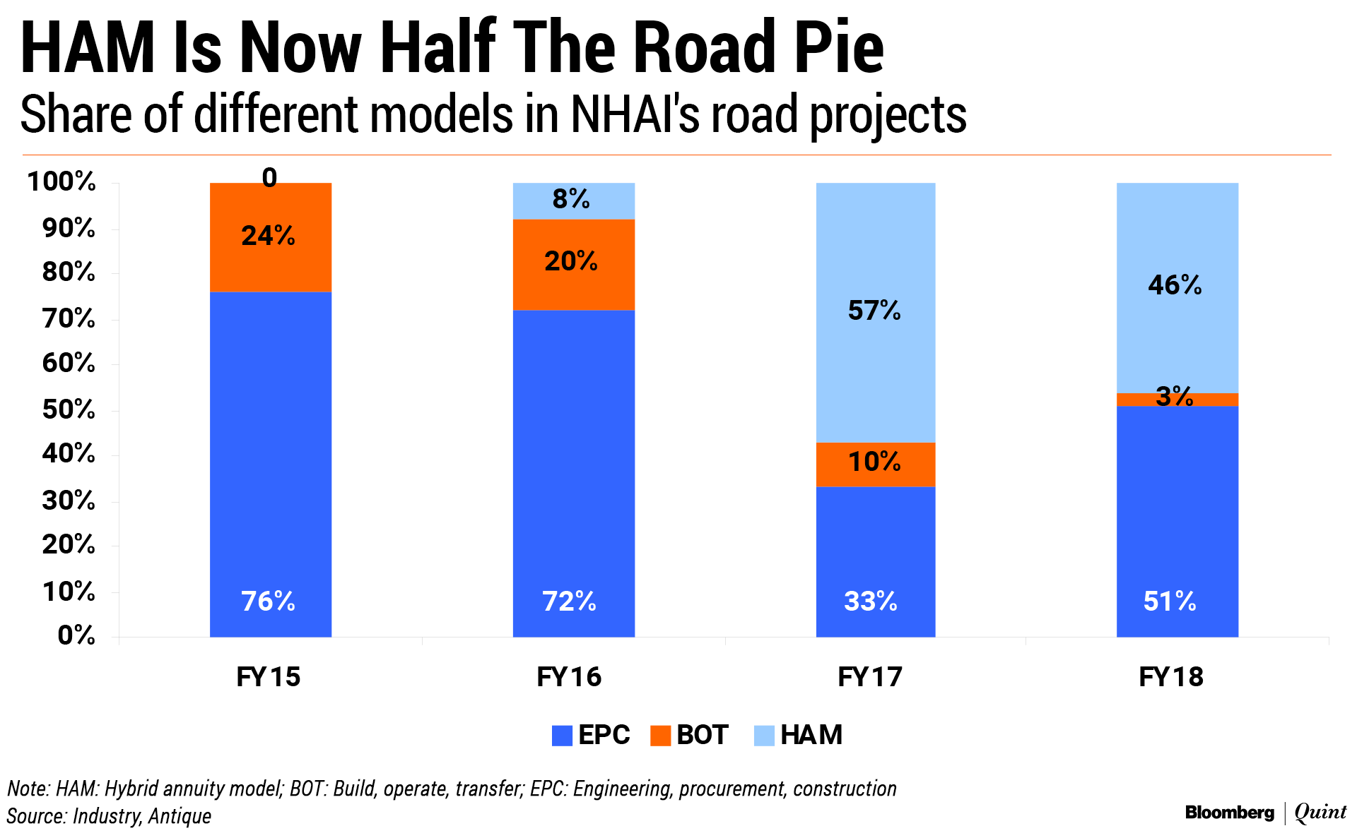 Much of this has been due to a shift from the Build-Operate-Transfer model to EPC and HAM. This was intentionally done by the ministry so as to ramp up the pace of road construction at a time construction companies' balance sheets were already over leveraged.