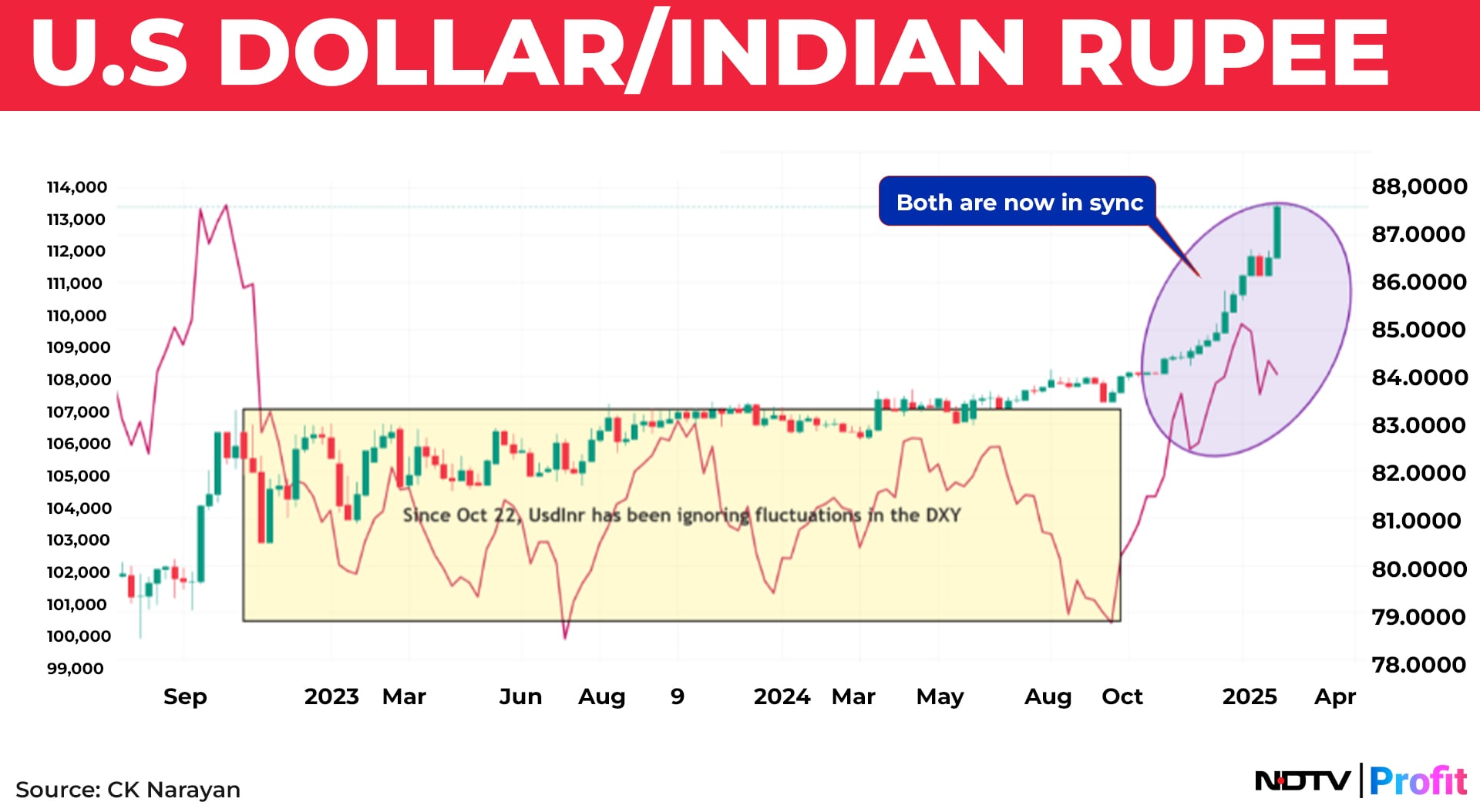 What is immediately noticeable in the chart is the extent of non-correlation between the USD/INR and the DXY. The latter has been on a swinging move for the past few years but that has left the USD/INR pair unmoved. It has been on a steadily losing trend and now, with the recent trend of the DXY, the USD/INR has gotten into some good sync with it. What caused that and how it shall pan out, I have no idea. Usually, when two items get into sync, then the strength of one rubs off on the other and vice versa. Over the last 6 months, the dollar has been on a strengthening spree and that has resulted in the INR getting pushed to new lows.