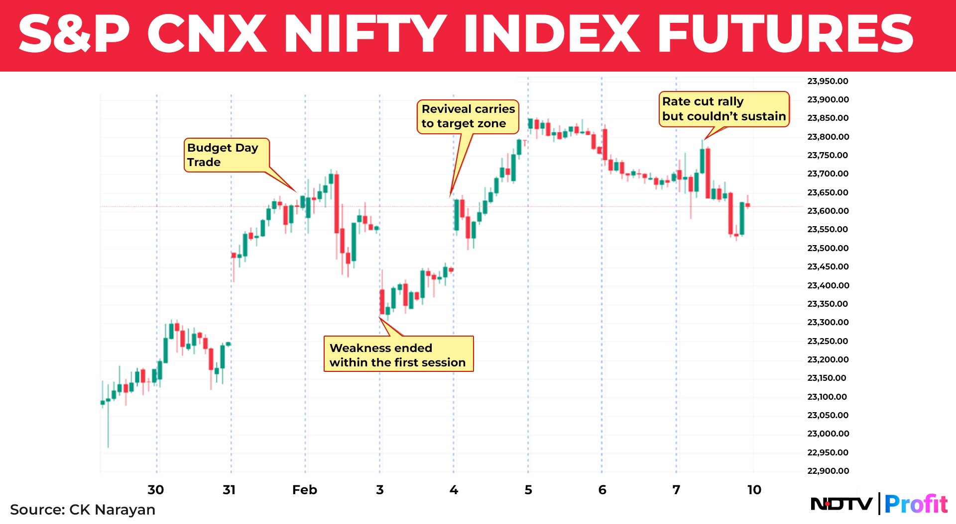 Whenever markets have to deal with multiple events, they are always hesitant. In that context, the progress that the market made was creditable. Particularly so when the Monday start was a scary one, with a wide gash at the open. This was in response to the imposition of tariffs from President Trump. Markets across the world chose to respect that, as did we and bears paid attention to that more than the positives thrown up by the budget. Many got spooked by Monday's weak start but keen watchers of the market got a glimpse of better times from the fact that the impact of the tariff action was digested by our markets swiftly (within the first 30 minutes of the day) and a good revival began from Tuesday. See chart 1 to know how last week's trading panned out.