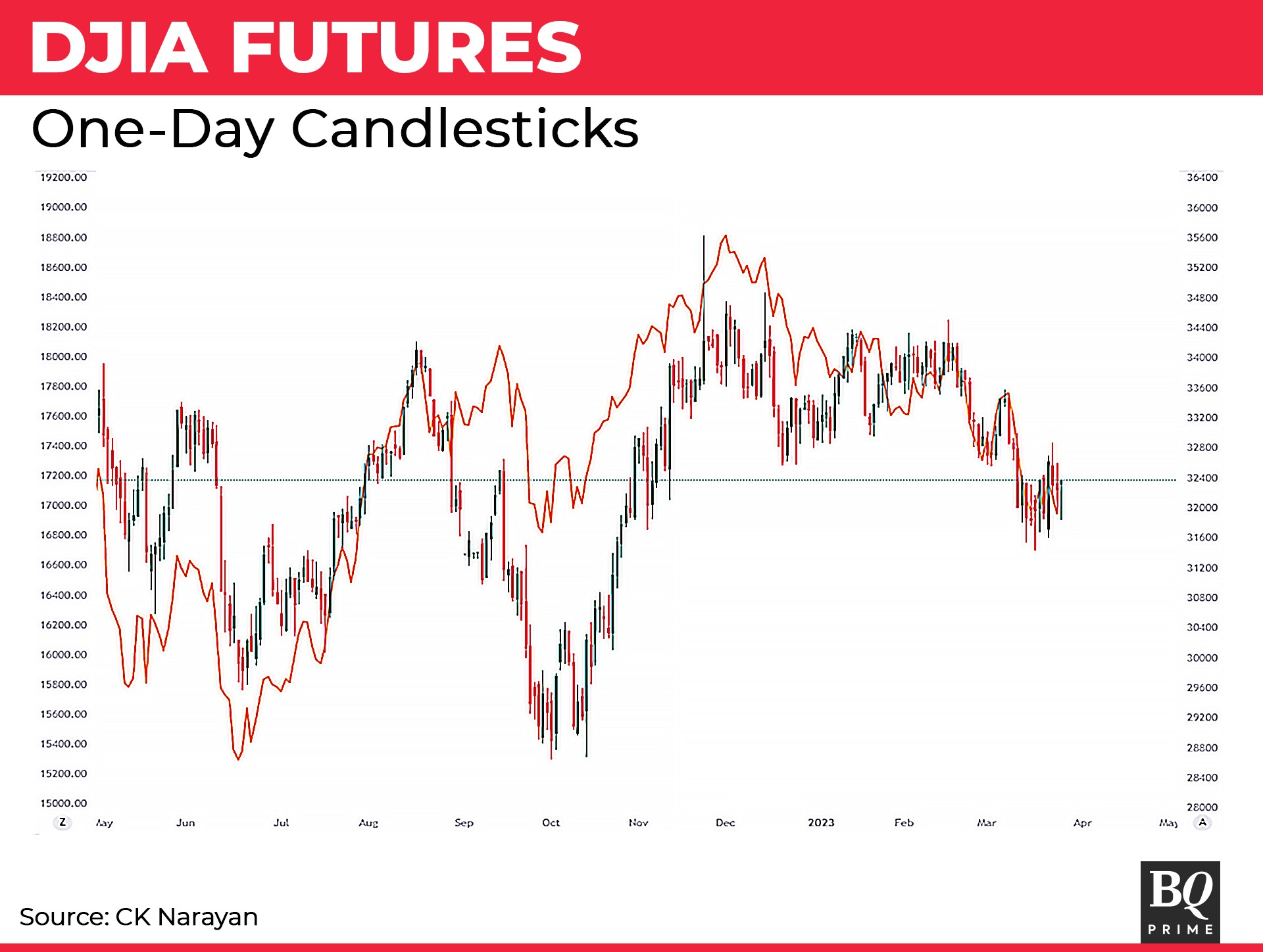 Over the last couple of months, we are moving completely in alignment with the Dow. Therefore, any relief has to come from there only! So we need to keep our eyes peeled on Dow and Nasdaq charts and our ears cocked towards news flow of events in the US. One thing to note in the chart 3 is that the Dow's bottom currently is considerably above the October 2022 lows while the low of Nifty is back down to those levels already. So the Nifty is at the 50% retracement of the move from last June, while the Dow has done 50% retracement of the move from September-October lows.