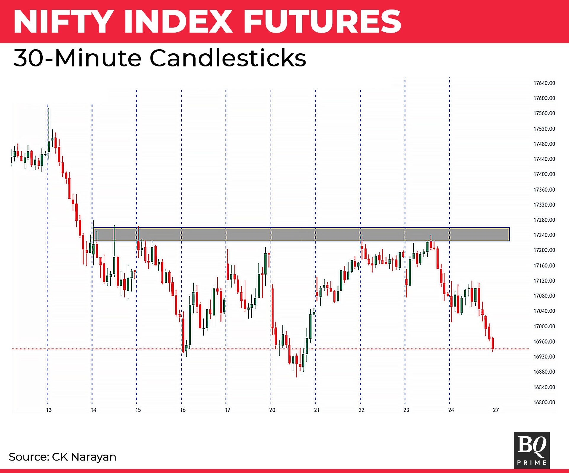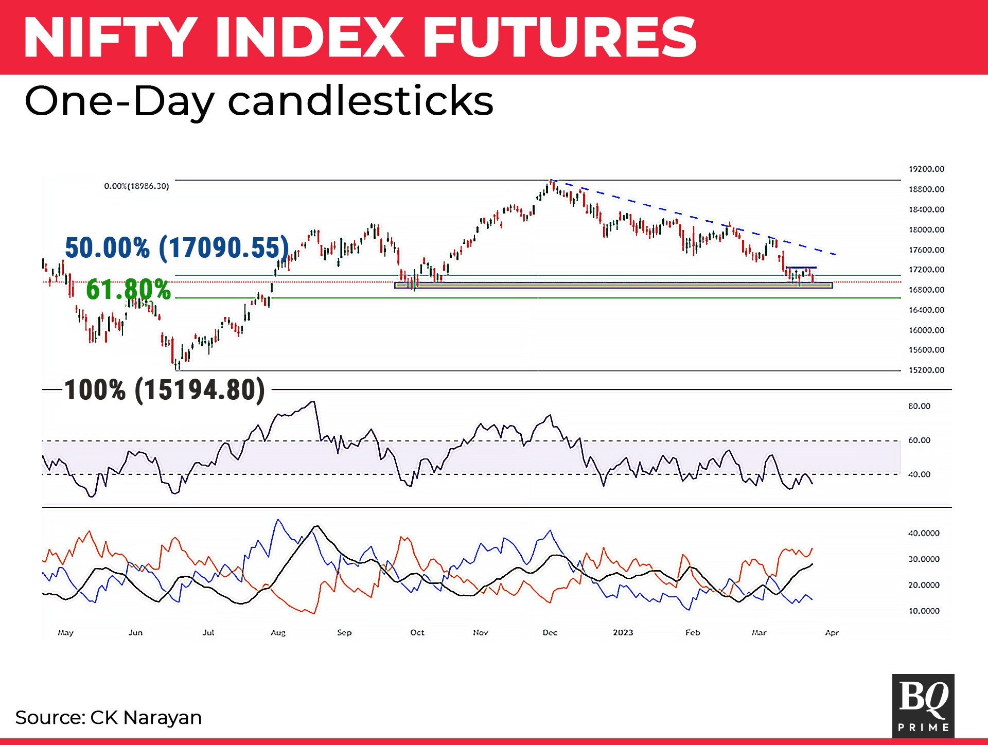 Declines can halt if prices hit support zones. The former swing low has been reached (the grey band). Prices have slipped beneath the 50% retracement and the 62% retracement now awaits at 16,650 area. Now, that can be the next target zone for the Nifty if declines continue. Hence, a break of last week's low would set it up, most probably. So, the first sign of weakness is if the low of last week at 16,931 were to give way.