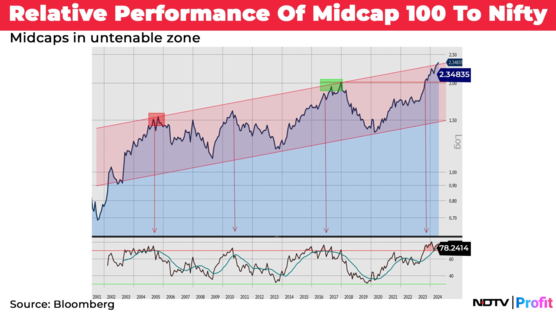 While this is one metric that has many spooked, the other one is relative performance of midcaps to large caps. Chart 3 shows a relative performance between Midcap 100 and Nifty (chart courtesy Bloomberg). This one show that the Midcap area has reached untenable areas in a comparative chart. The levels are at a nicely channelled resistance.
