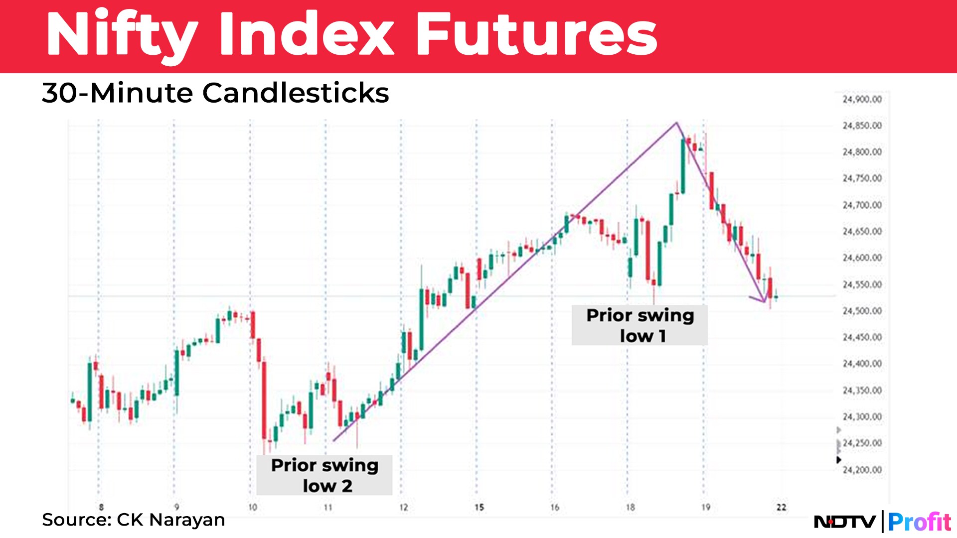 The week just ended was a converse of the week earlier. We went up for most of the week and then got knocked down on Friday. Through the week, the Nifty managed to chalk up fresh all-time new highs, hitting 24,838 on the futures on Thursday. Friday's session was a bit anticlimactic. Infosys results were expected to power the Nifty higher. But the index opened at a high, and then dived headlong into the close, finishing near the lows of the day. In fact, it was the first time since June 4 that the Nifty not only broke the prior day's low and closed lower too. Until now, it had managed to spring up from such bouts of decline. While that may raise some small fears of the pullback extending, we note that the index has just pulled back to the prior swing low only. Chart 1 shows this action. As mentioned, many times earlier, a minimum stop that needs to be kept should be two swing lows behind the current high. By that token, the stop would have been in the 24,250 regions only.