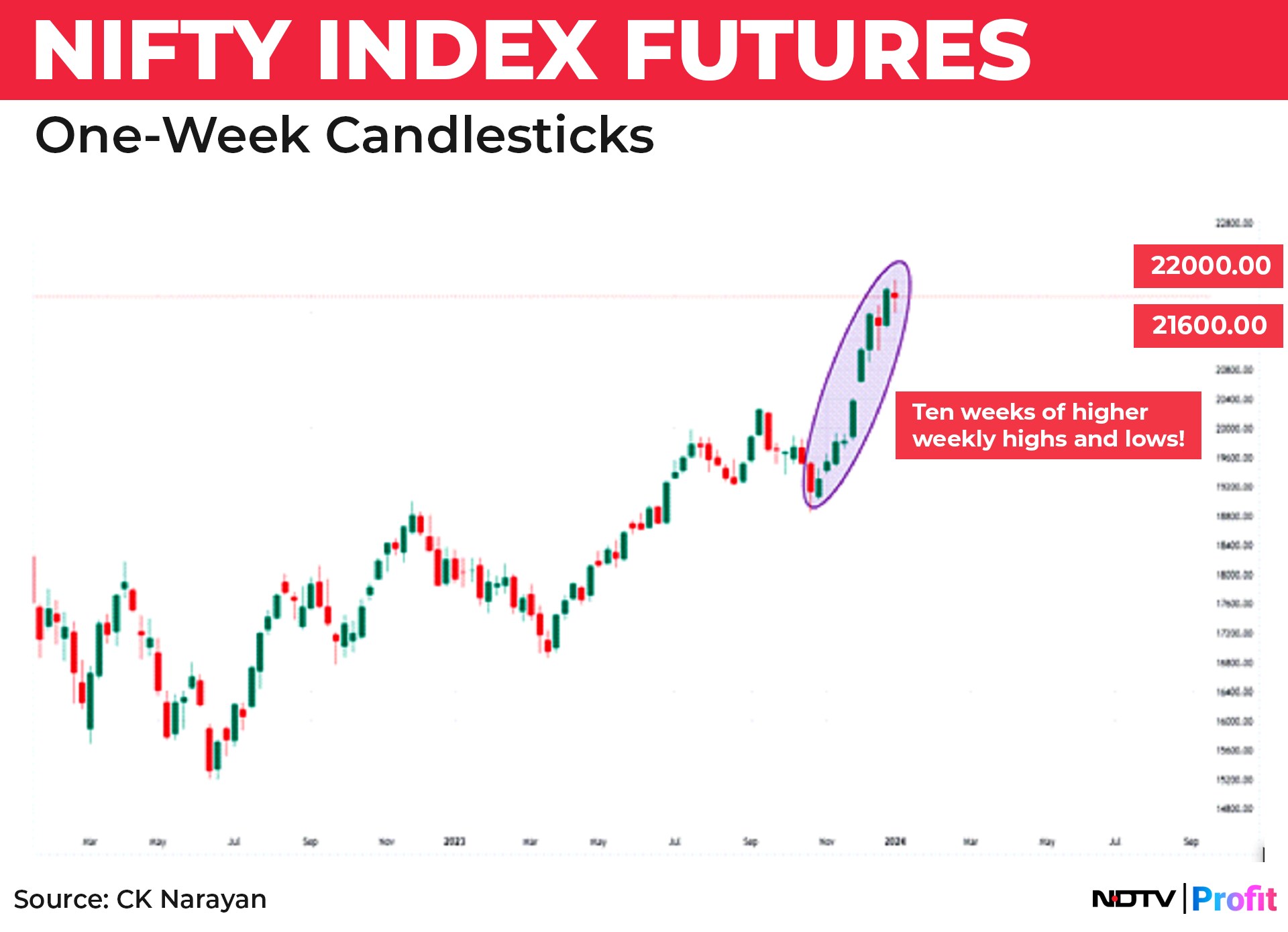 But the pattern on the weekly charts continues undisturbed, too. We closed the week as being the 10th one in succession where the prior week's low has not been broken. Not just that, it has also been in unbroken higher highs for 10 weeks in a row. It is not rare to see higher tops being put in, but to see them also accompanied by higher bottoms in succession is something that I have not seen in a while. This also means that there hasn't been a consolidation week either. No wonder the party has been so fantastic. This move actually began from the Oct. 26 low, got a boost post the state poll results on Dec. 3, and has not let go until now.