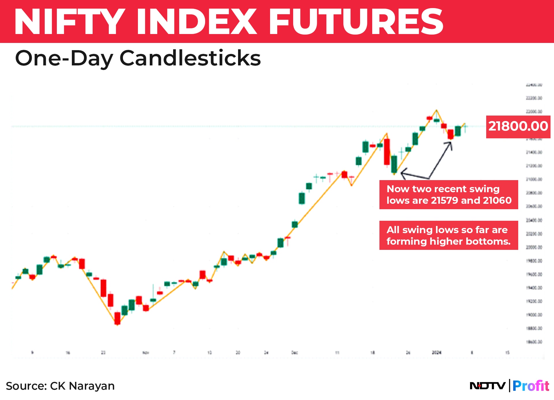 This is important from the stoploss setting level. The usual practice is always to set a stop below two swings behind. Thus, as a trend follower, the trailing stop on a long Nifty futures position, the stoploss moves up from 20,900 last week to 21,060 at the end of the week. All swing bottoms are still higher than the prior ones, ensuring that the trend definition, which is up, remains undisturbed.