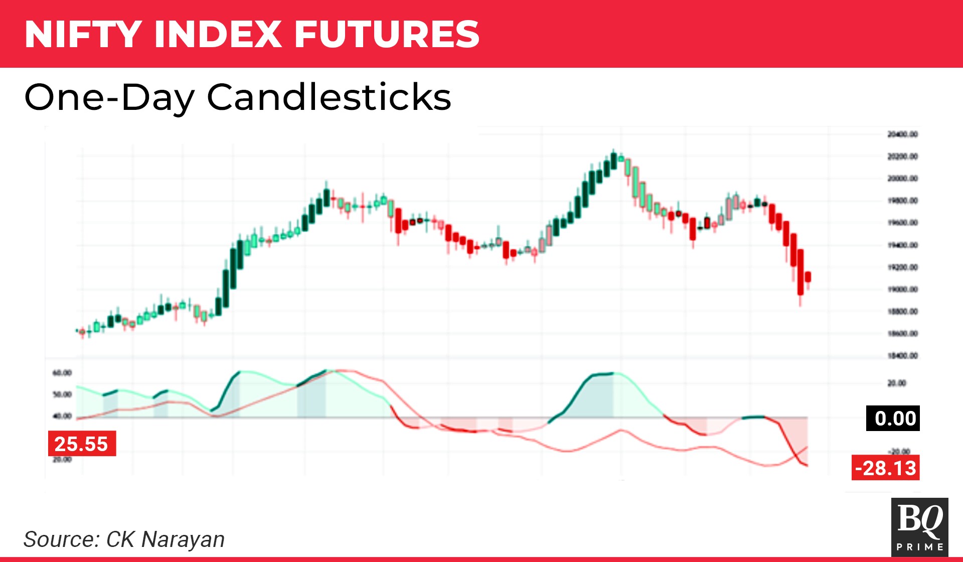 This shows the daily chart of Nifty in Heiken Ashi style and accompanying that is a modified ADX indicator. Two things are apparent here. First, the HA candles are clearly bearish yet and do not show any chance of a big revival right away. Two, the ADX indicators are in a clear bearish mode and will take some time to reverse. For both these signals to get reversed effectively, the index will have to make some good and consistent strides higher.
