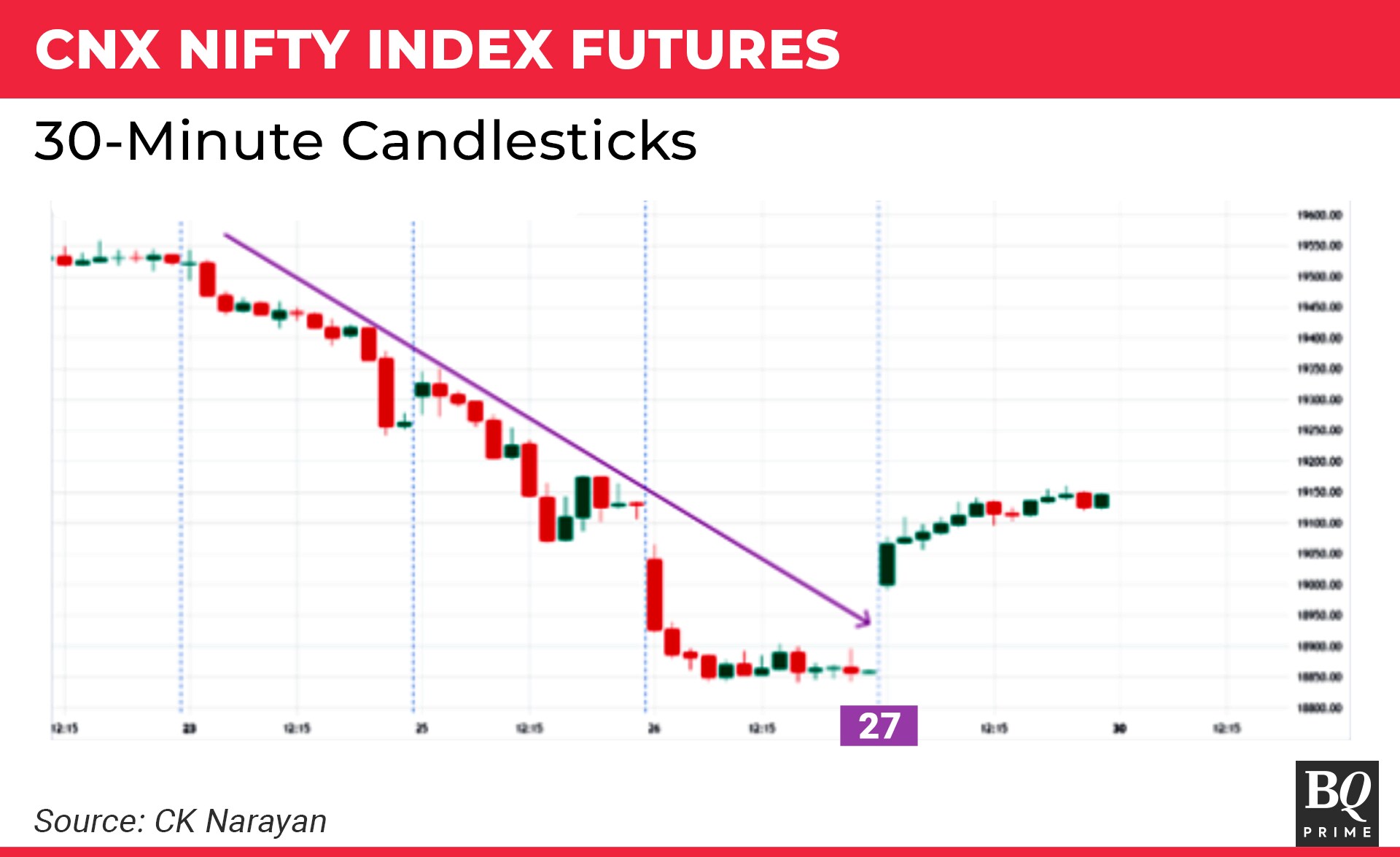 The market got clobbered all the way during the week that just ended, and the small recovery on Friday was a meagre effort by the bulls. In the last letter, I had continued the bearish forecast into the week and said that matters will turn worse before they can get better. Chart 1 shows the intraday picture of the move over the week.