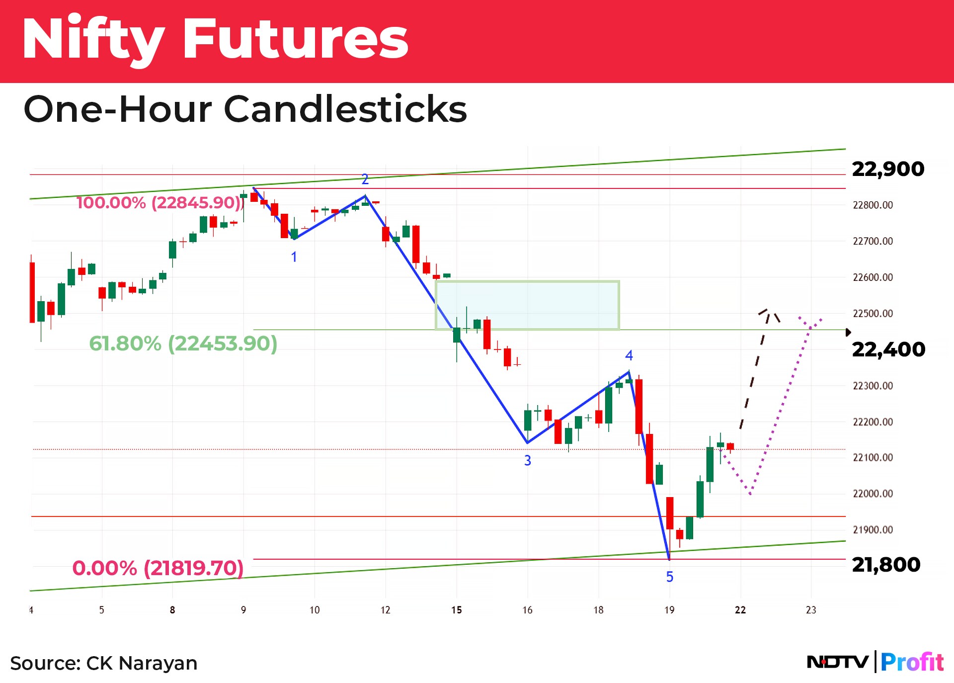 That is placed at 22,450 and there is a gap zone just above it at 22,550. So, that is the target zone that we can make for a rally, if one were to unfold from here. Two pathways are shown and market may choose either, but with similar targets. The only caveat here is that prices should not go below the start of the move (mentioned earlier). Hence targets and stops for the week are inherent here in this discussion.