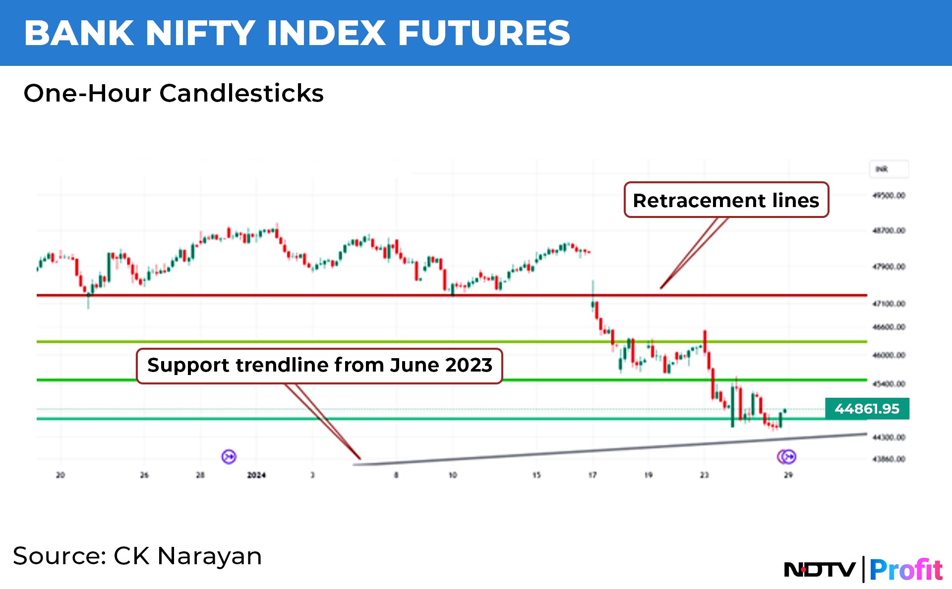 Here we note that the Bank index has fared much worse than the Nifty and that may have caused a lot of problems since majority of day traders are present here. We see that the prices have slipped to 62% retracement of the upmove since the Oct. 23 low (in comparison, the Nifty is not even down 25%) and the prices have nearly reached the main support trendline coming up from the major low back in June 2023. In fact, a break of this support could well mean more trouble for the banking pack.
