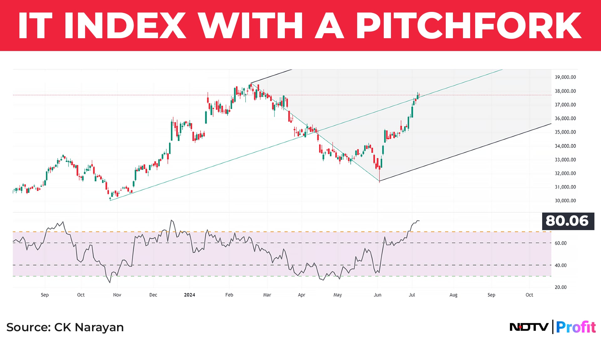 Results are going to flow and IT will be first off the block. Attention is already flowing there and patterns are forming on the charts. Feeds from overseas in tech stocks seems to be positive too. Chart 4 shows the IT index with a pitchfork and it can be seen that the median line is to be crossed and the rise is with some good new momentum. Stocks have all rallied but going ahead, only stocks that beat market expectations on the results may continue higher. So, watch whether that median line breakout sustains ahead.