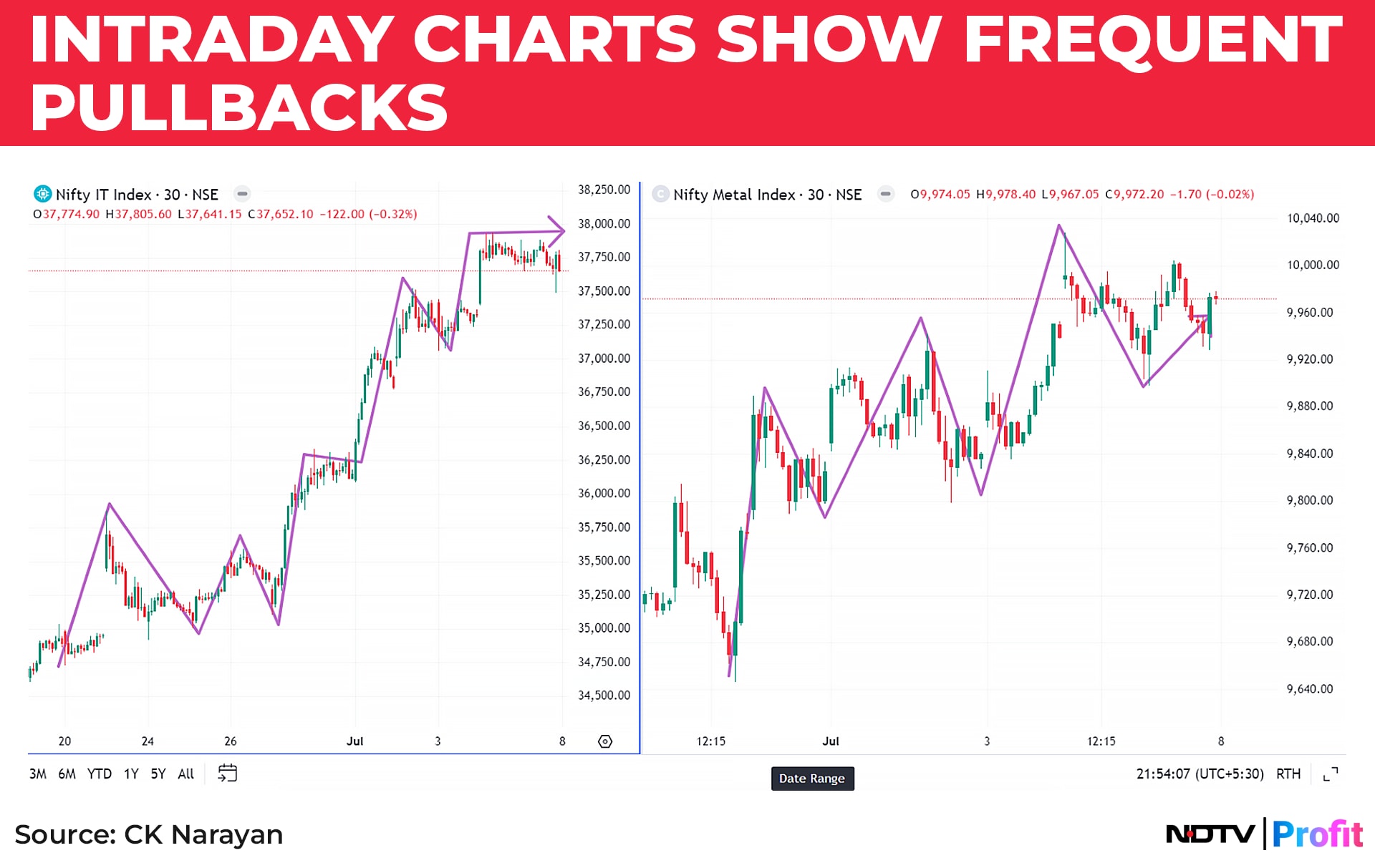 So, the question is, what do we do in such markets? The answer remains similar to earlier letters. Maintain a bullish posture and exercise patience to wait for dips to buy into. It is not as though these pullbacks don't come. Chart 3 is intraday charts of IT and Metal indices showing frequent pullbacks. Even in IT where some trend is also seen recently. Patience to wait for it is the key.