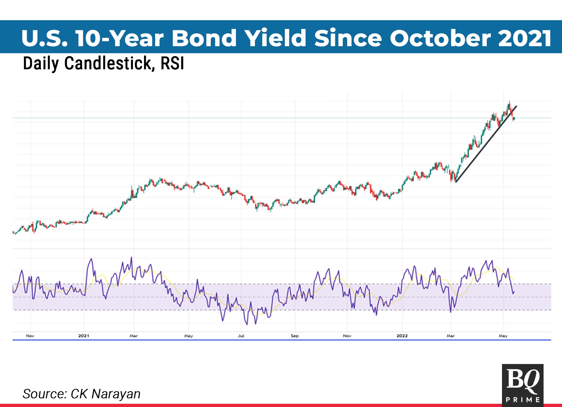 If you recall, it was the U.S. 10-year bond yield surge a few months ago (September 2021 and again in January 2022) that started the nervousness. It has been progressing pretty well since and hit a high at 3.20% by May 9, 2022. Now that is a pretty brisk move for something that had been lying around dormant for years. As of now, the chart of the 10-year shows some profit-taking coming in. The third chart shows the trendline support of the fast rise from the March 2022 low being broken and the RSI also into a divergence at that high. Now the yield move down is accompanied by a lower RSI. Although there is a possibility of a positive reversal pattern developing in it (if a 2.72 close is not taken out), one may not want to bet on it.