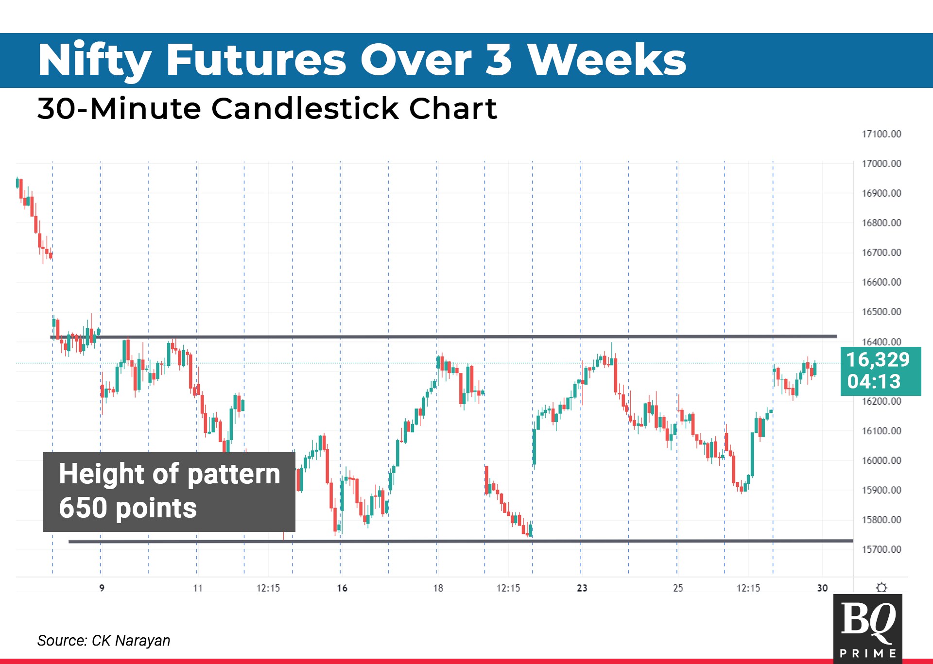 I am not a big fan of rectangles (because any consolidation in the market can be captured between two lines, most of the time), but this one is a classical one and cannot be missed. Also, it makes forecasting easy. The width of the range is 650 so, upon a breakout, that is the extent the index may traverse. As a result, we get targets of 17,050 and 15,100. This should be just dandy for option strangle players.