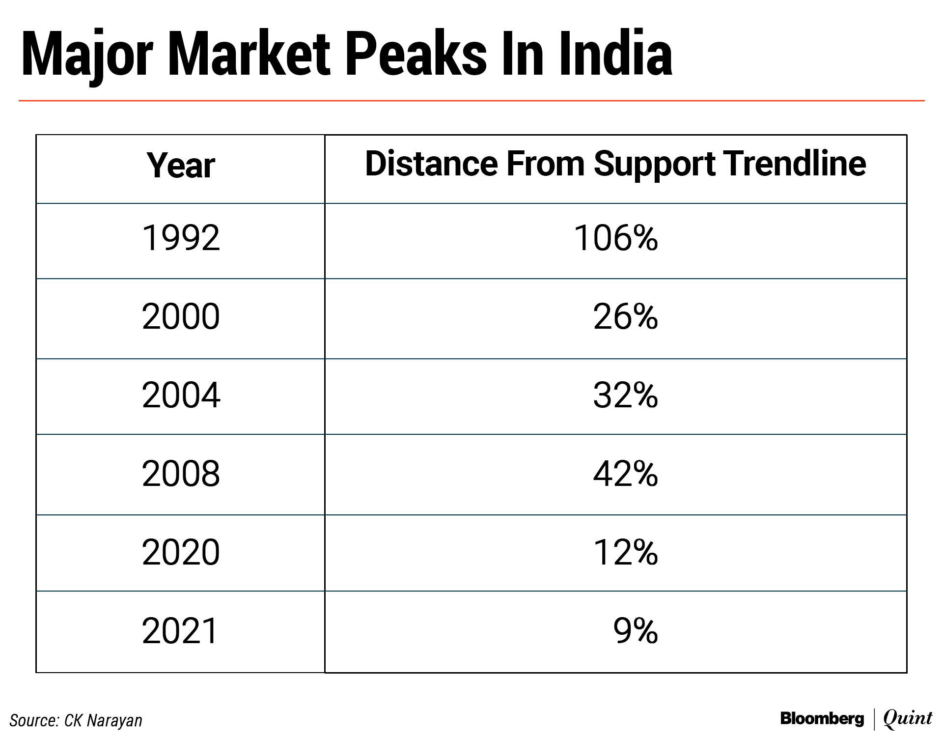 So, I dug into the past and measured some major market peaks and the distance they were away from the main support trendline at that point in time. The table below shows this data.