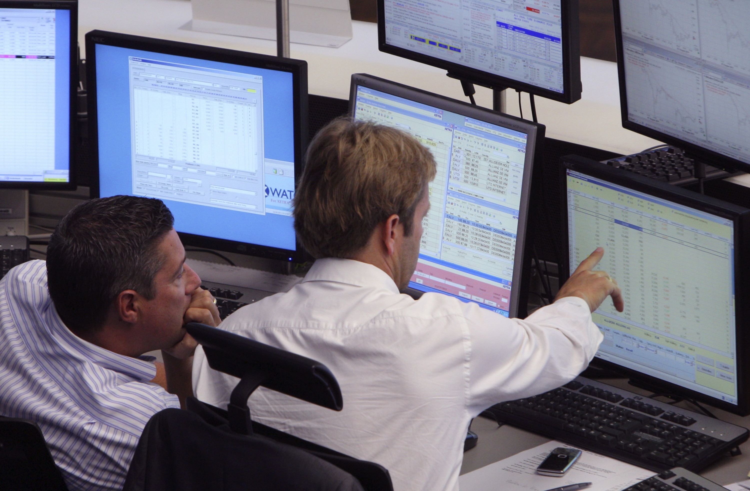 A trader points to data displayed on a computer screen. (Photographer: Hannelore Foerster/Bloomberg)