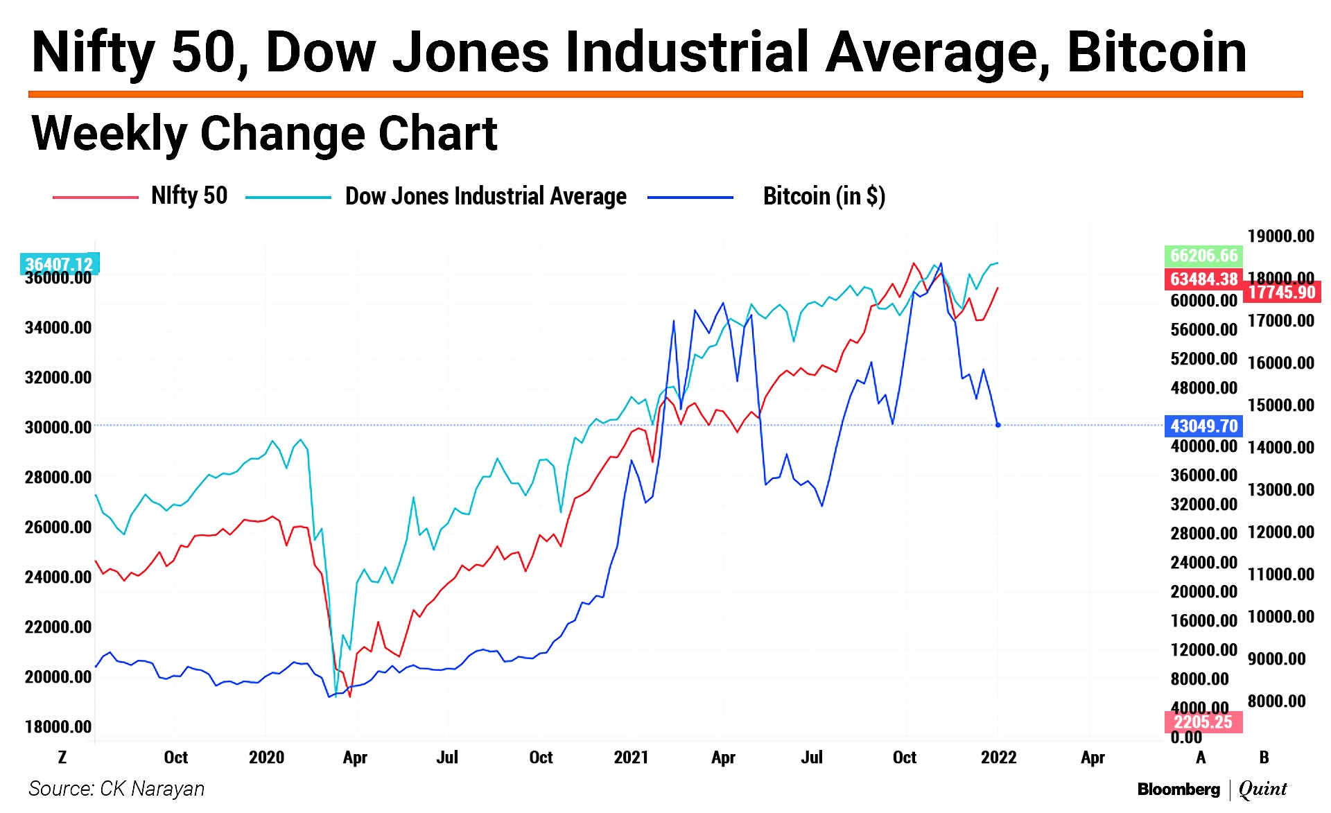A super trend was seen in the Nifty 50, Dow Jones Industrial Average, and Bitcoin from the 2020 low till Apr 2021.