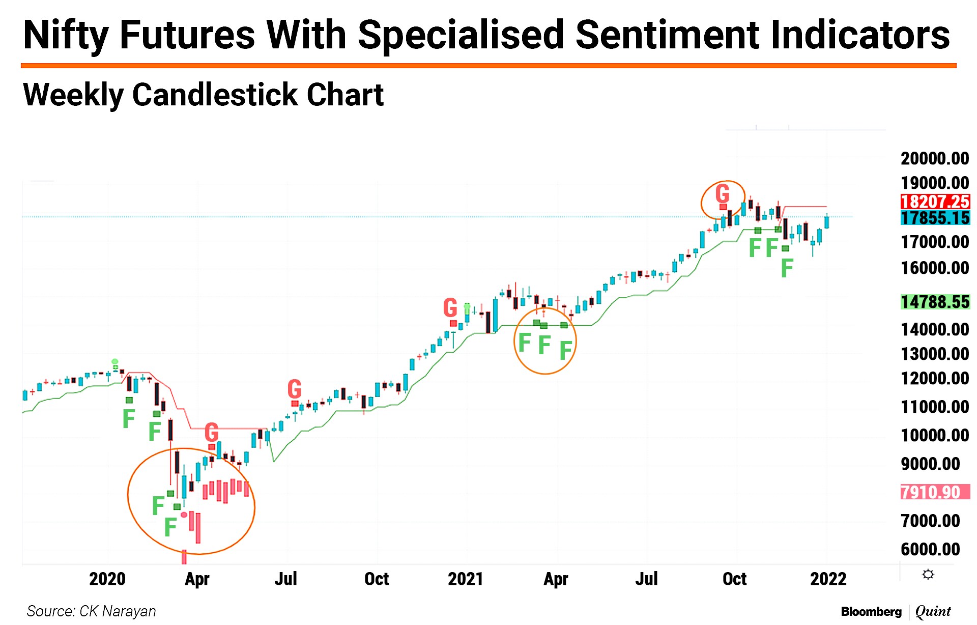 There are yet other indicators in technicals that can use price action combined with other tools to create a Sentiment Indicator directly. These are specialised indicators. The next chart shows one such indicator. It can be noted that the bottom of March 2020 and immediately after was heavily identified as being a strong ‘fear' region. This is shown by a large ellipse, within which note multiple red bars, indicating a sentiment low point.