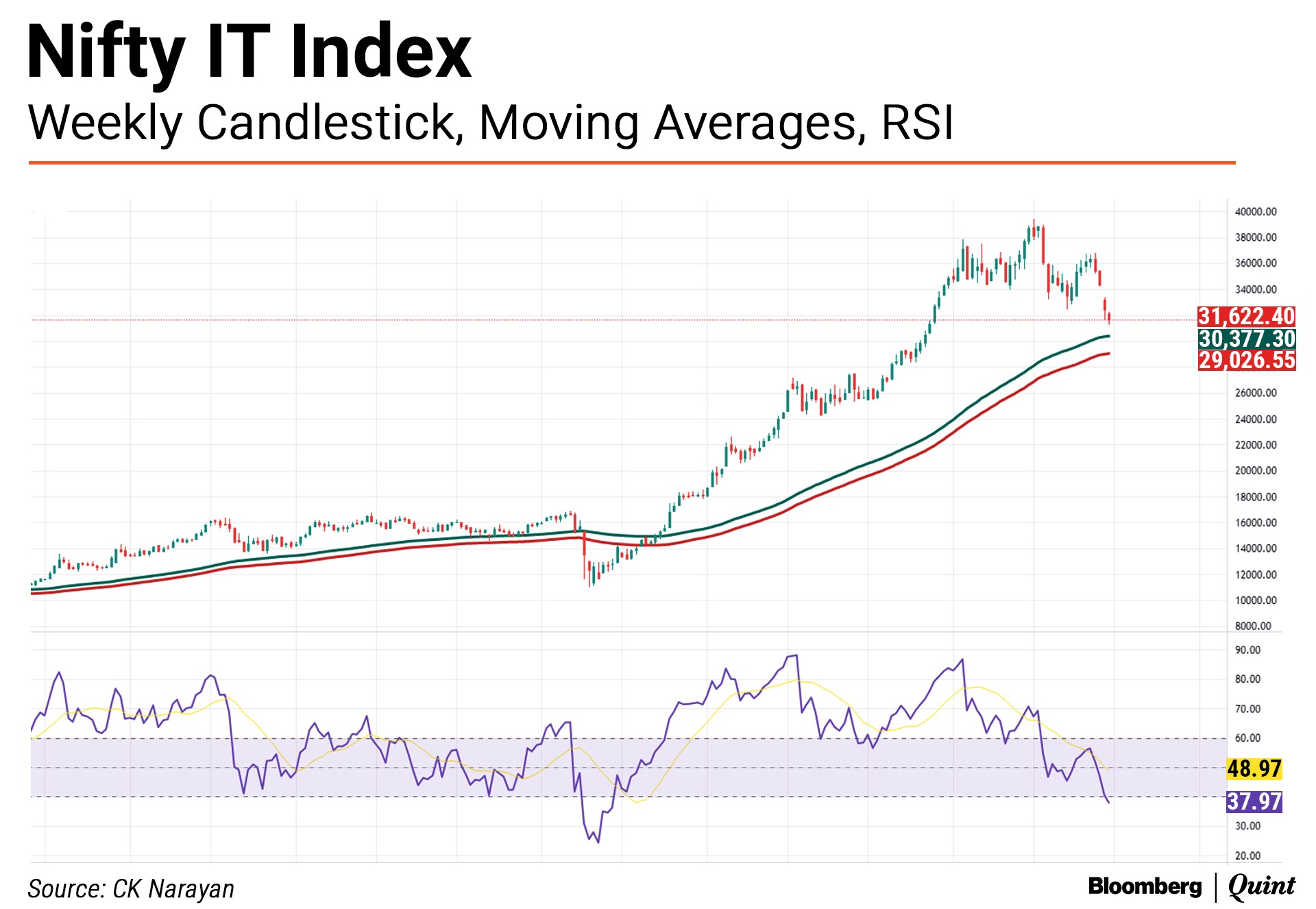 Meanwhile, because many sector indices have hit support zones during the decline of the last 3-4 months, there is some hope about their prospects, were the market to make an attempt to improve from here. However, that is not the case with the IT index, where such support (provided by the moving average bands) is yet to be reached, as can be seen in the fourth chart. Also note in this chart that the weekly RSI of the IT index is seen breaching the 40 levels too. Not too healthy a signal, that one.