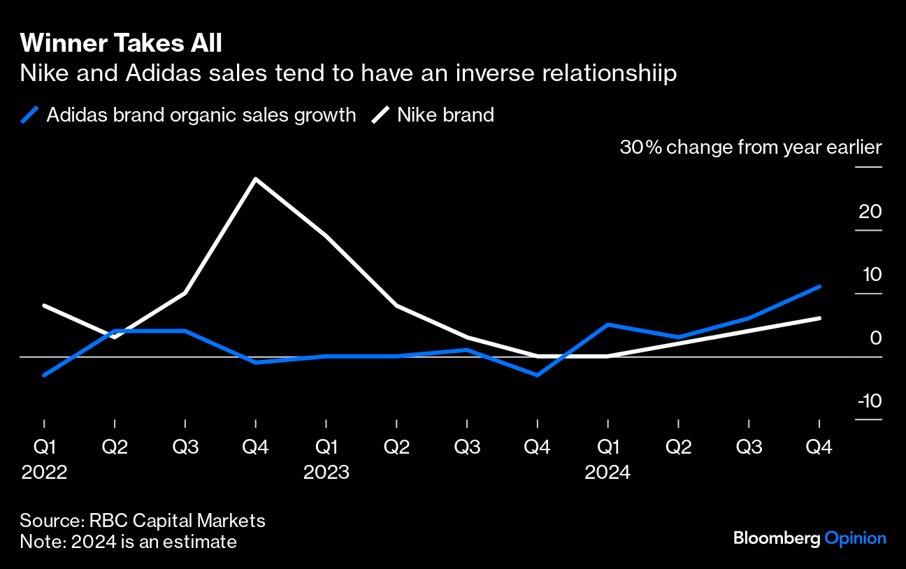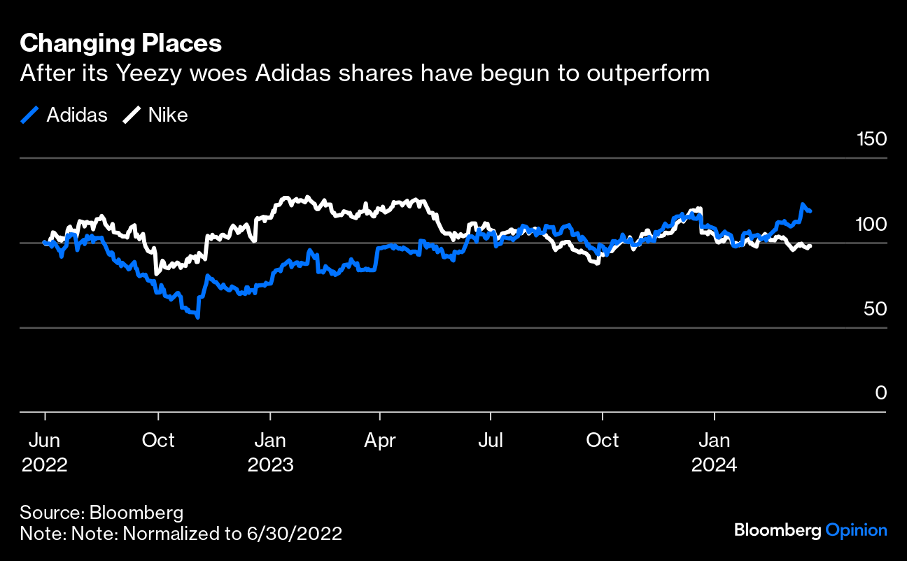 It's also worth remembering that Adidas is still early on in its turnaround efforts. It forecasts just €500 million ($543 million) of operating profit this year, compared with almost €2 billion in 2021. Gulden is aiming to lift its operating margin to 10%. Nike, for all its challenges, is expected to delver 12.3% in the year to the end of May, according to the Bloomberg consensus of analysts' estimates.