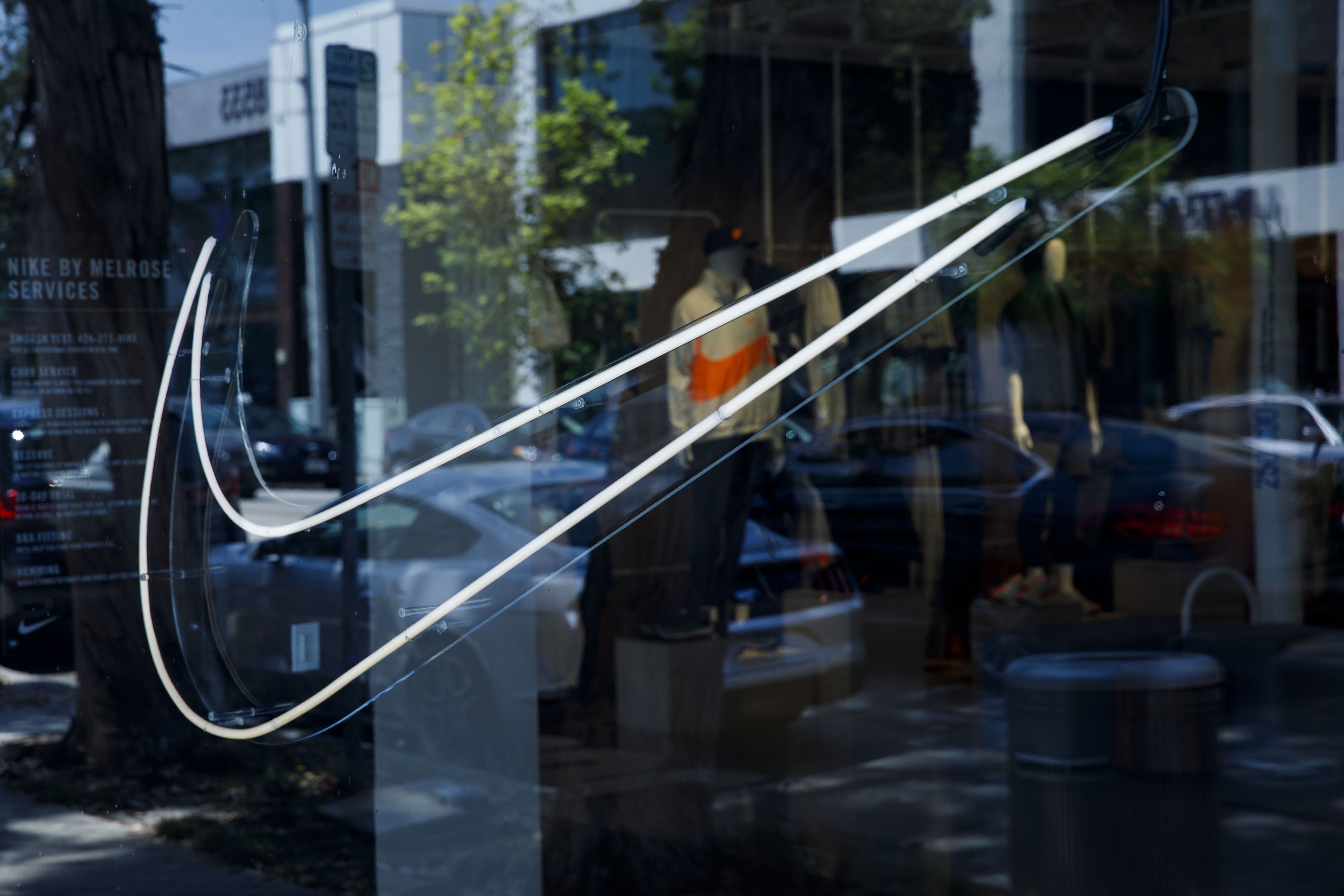 The Nike Inc. logo is displayed in the window of the Nike by Melrose live concept store in West Hollywood, California, U.S., on Monday, July 30, 2018. The return to growth in the U.S., a market that has been challenged for over a year, is a testament to the strength of Nike's recent product pipeline, which is driving an improved sales outlook for fiscal 2019. Photographer: Patrick T. Fallon/Bloomberg