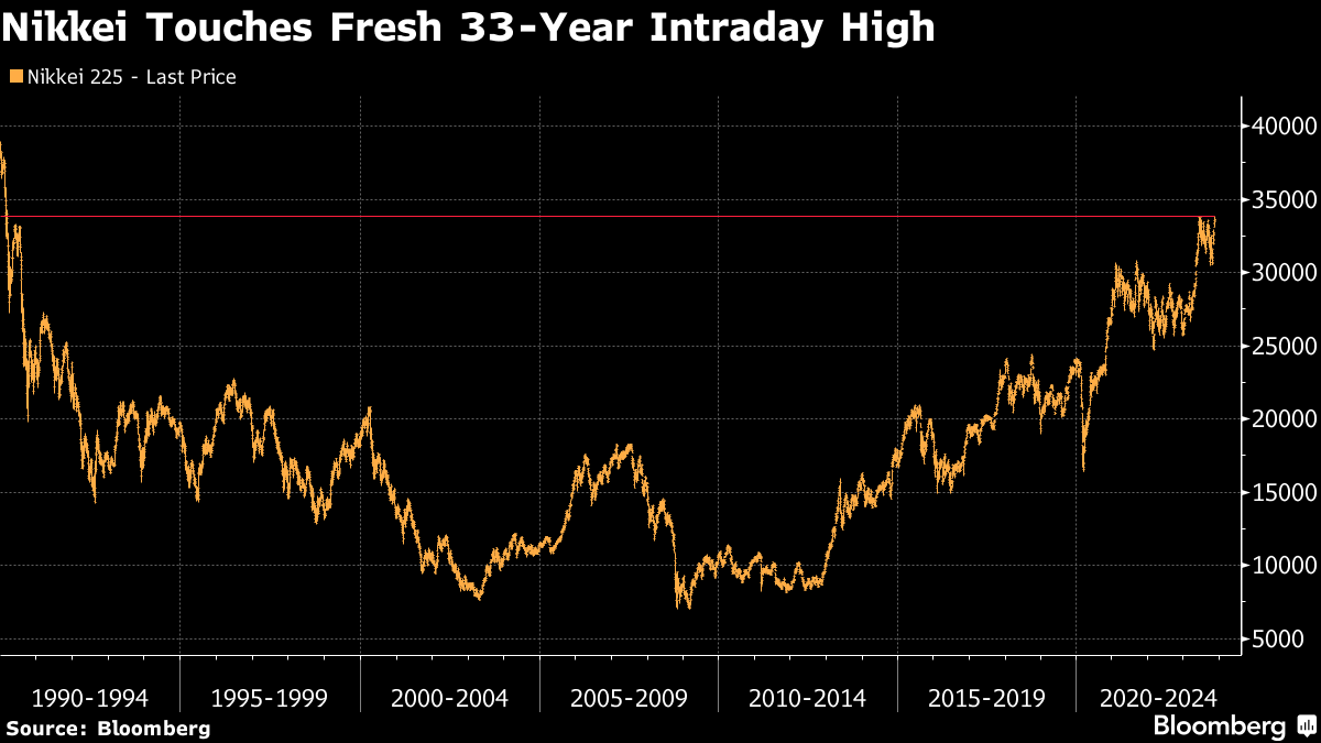 (Bloomberg) -- Japan's Nikkei 225 Stock Average erased earlier gains that saw the blue-chip gauge briefly surpass its June intraday peak to reach the highest level in 33 years.