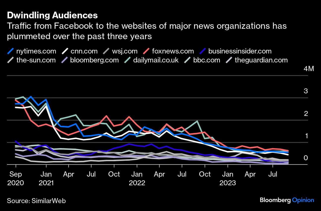 This was the peak of Facebook's attempts to woo the news business. Today, it wants little to do with it. As noted by Axios, referrals from the Facebook app to news sites have plummeted because articles are no longer receiving any algorithmic support. Meta Platforms Inc. — as the company is known now — has discontinued the special tab on Facebook for news content in the US, UK and elsewhere, and the company openly said it wouldn't prioritize news on Threads, its new competitor to X, formerly known as Twitter.