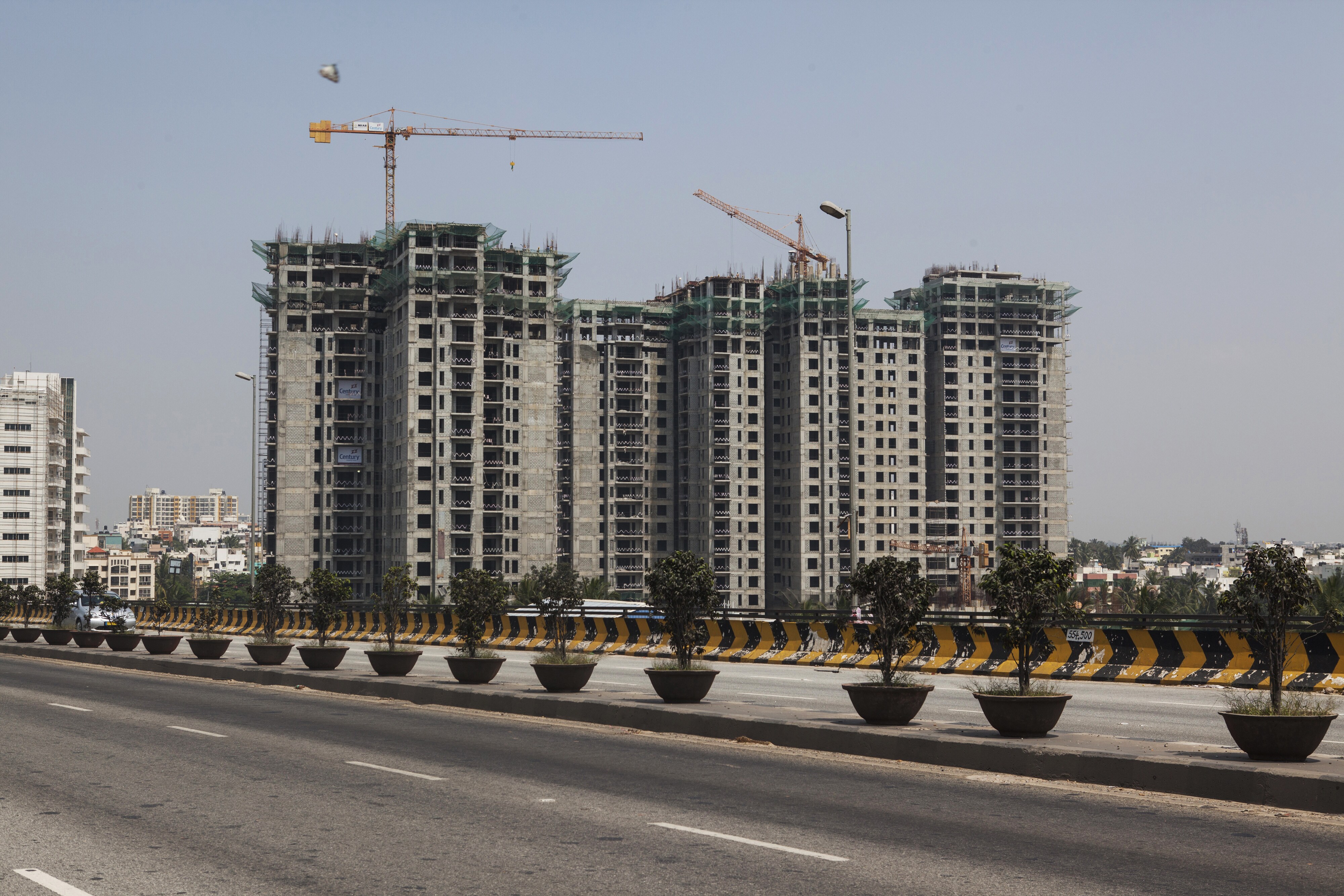Cranes operate on residential construction site next to a highway in Bengaluru. (Photographer: Lakshmi Samyukta/Bloomberg)