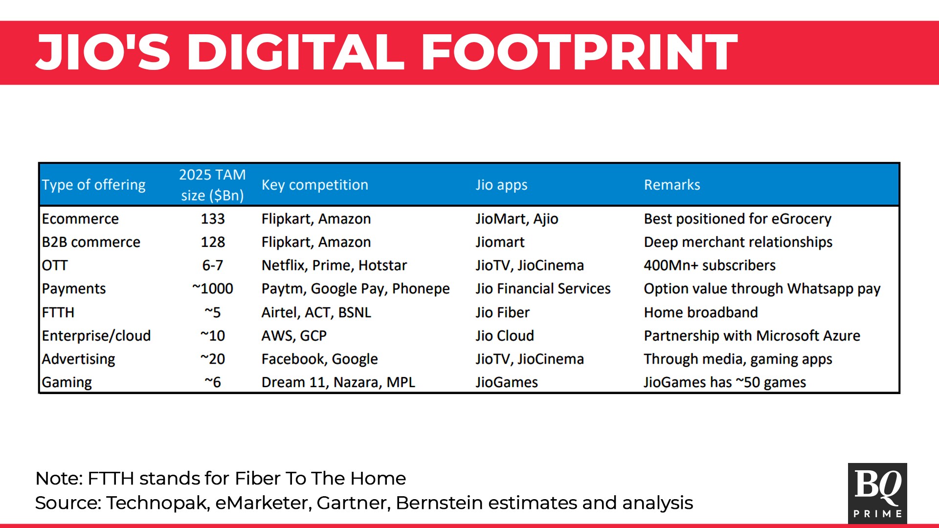 Bernstein highlighted that Reliance had the most disruptive playbook, using an integrated approach to consumers—$18 billion gross merchandise value (Reliance Retail Ventures Ltd.), 35.5 crore consumers (Jio Platforms) and compelling prime apps (JioTV, MyJio, JioSaavn and Jio Prime). "This makes RIL the only Indian player to have an integrated offering and the ability to compete with global tech giants (Amazon, Walmart)."