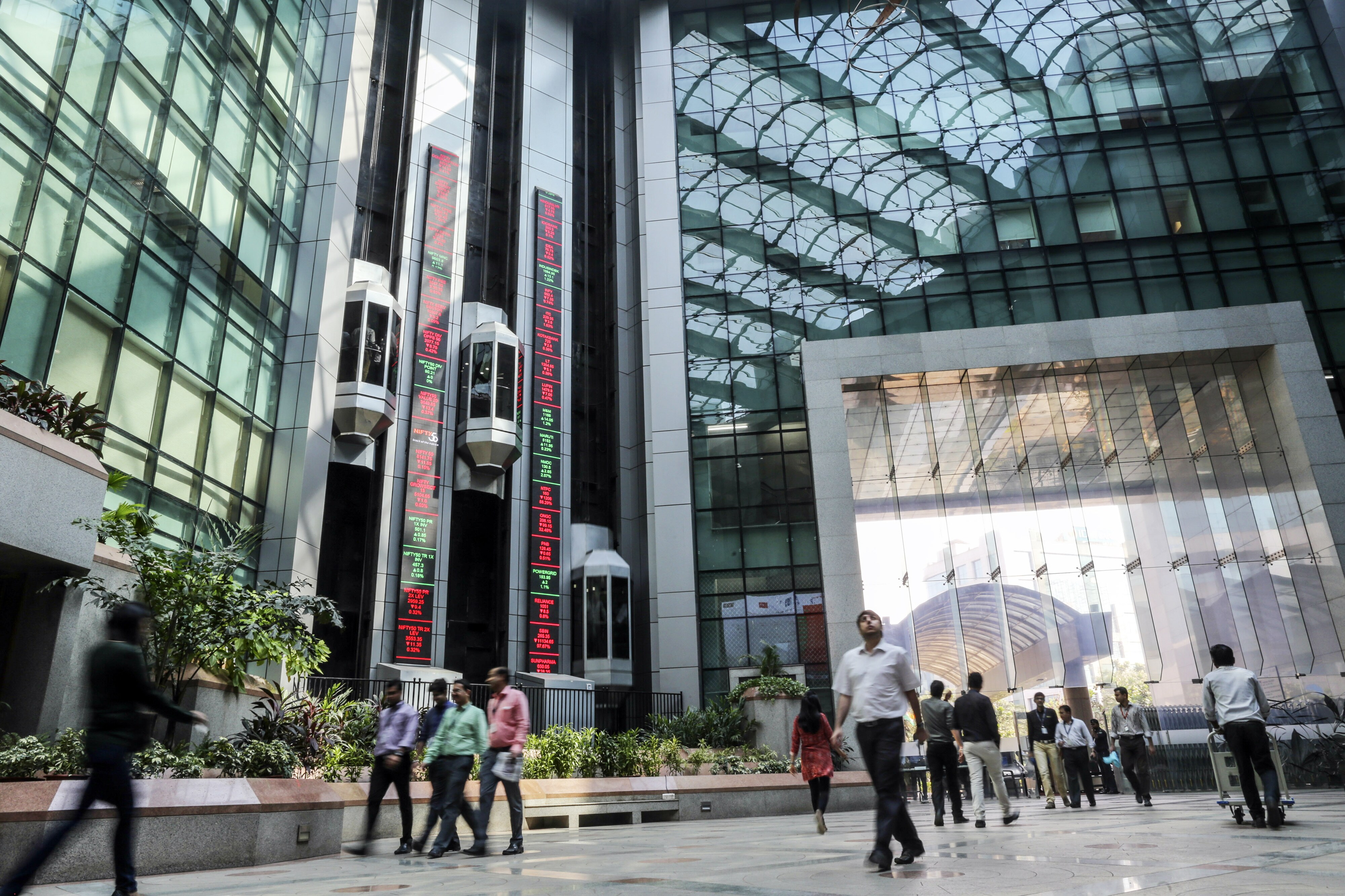 Employees walk past electronic boards displaying stock figures in the atrium of the National Stock Exchange of India Ltd. (NSE) building in Mumbai, India (Photographer: Dhiraj Singh/Bloomberg)