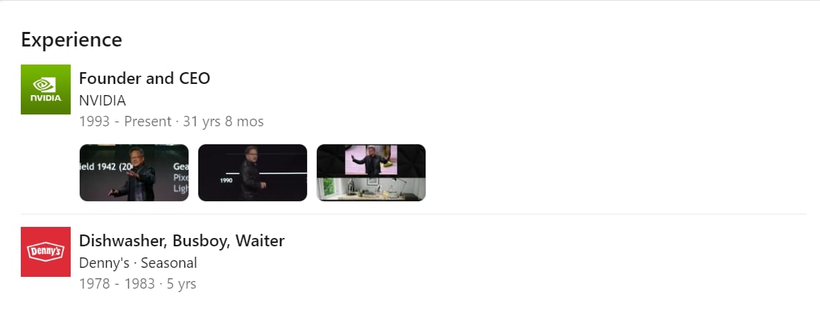Jensen Huang, the CEO of American chipmaker Nvidia has listed 'dishwasher', 'waiter', and 'busboy' in the experience section of his LinkedIn profile. He is the 12th richest man in the world with a net worth of $112 billion according to the Bloomberg Billionaire Index.