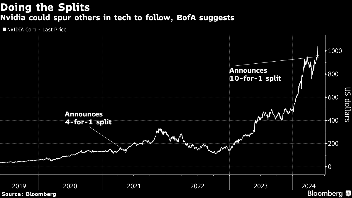 (Bloomberg) -- Nvidia Corp. delighted investors when it announced a 10-for-1 stock split earlier this week. The move may be the start of a trend, as several prominent tech companies trade at prices high enough to tip the scales toward similar splits, according to a note from Bank of America.