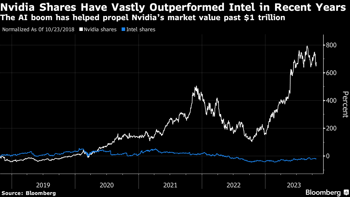 Intel, in contrast, has seen its valuation slide in recent years. Even with a rally in 2023, the company currently stands at about $142 billion.