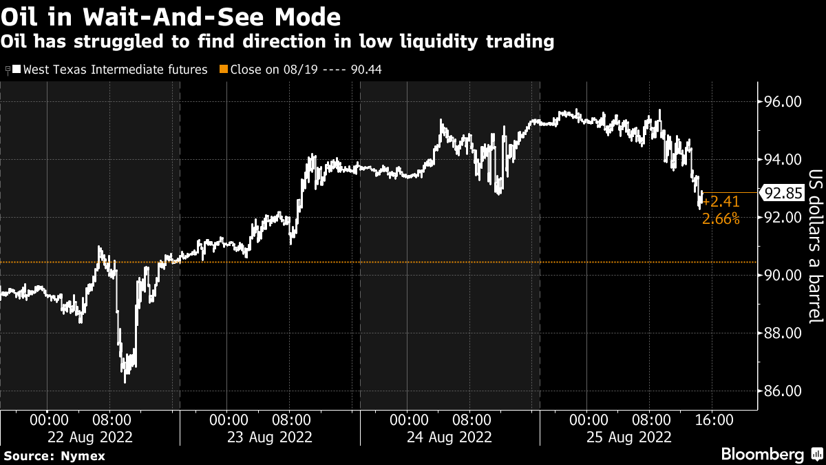 West Texas Intermediate fell 2.5% to below $93 a barrel. Following a choppy start, the market drifted lower as Fed officials dropped hawkish hints on economic policy ahead of the central bank's Jackson Hole symposium. Rate hikes are typically seen as bearish for crude demand as they are aimed at cooling off the economy. Still, futures struggled to find direction this week, trading in close to a $10 range.