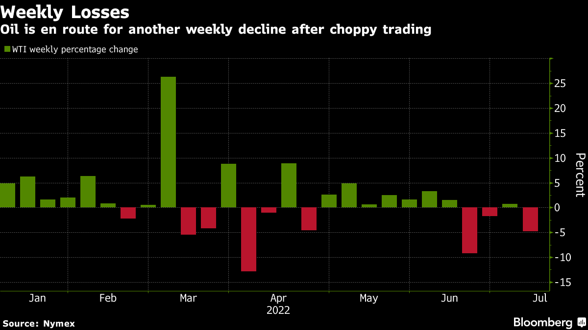 (Bloomberg) -- Oil headed for a weekly loss after a week of volatile trading that saw recession fears run headlong into a fundamentally tight supply picture.