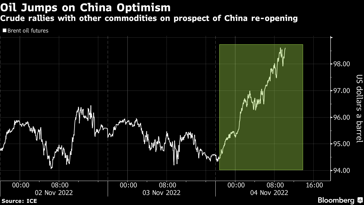 (Bloomberg) -- Oil jumped to the highest in more than three weeks as markets rallied over China easing its Covid restrictions.