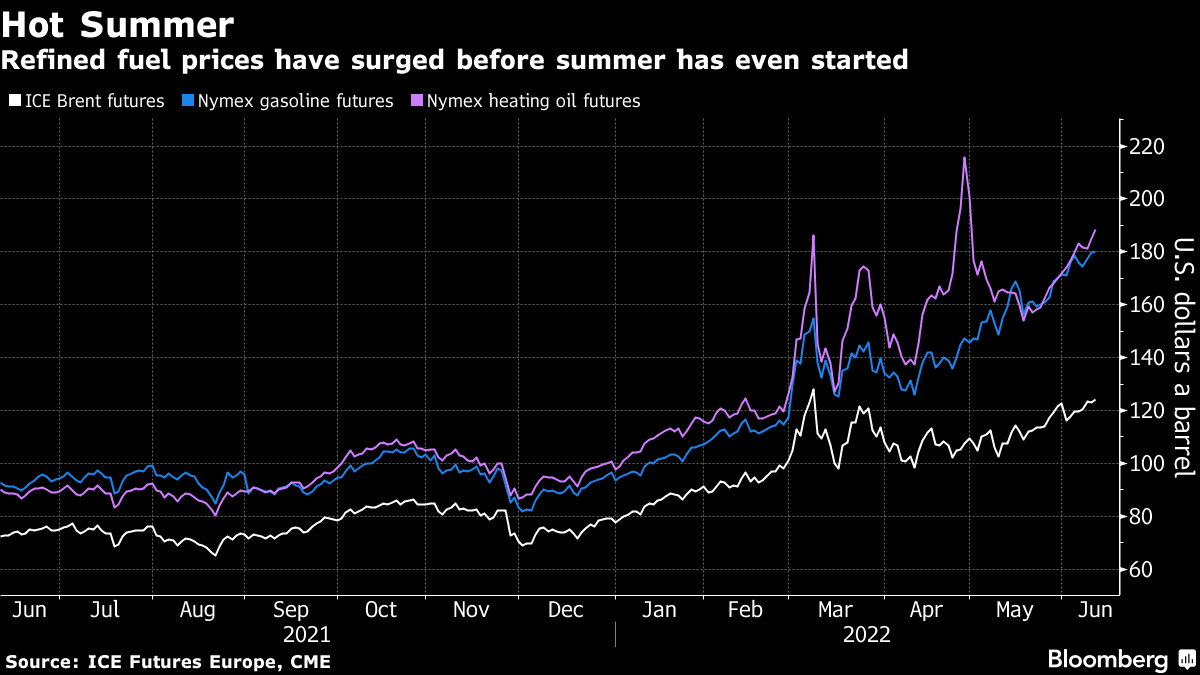 Russia is a major supplier of refined products, most notably diesel, where wholesale prices in Europe are around $170. The premium of both diesel and gasoline over crude has hit a record this year in the US and Europe, with fuel stockpiles low going into summer.