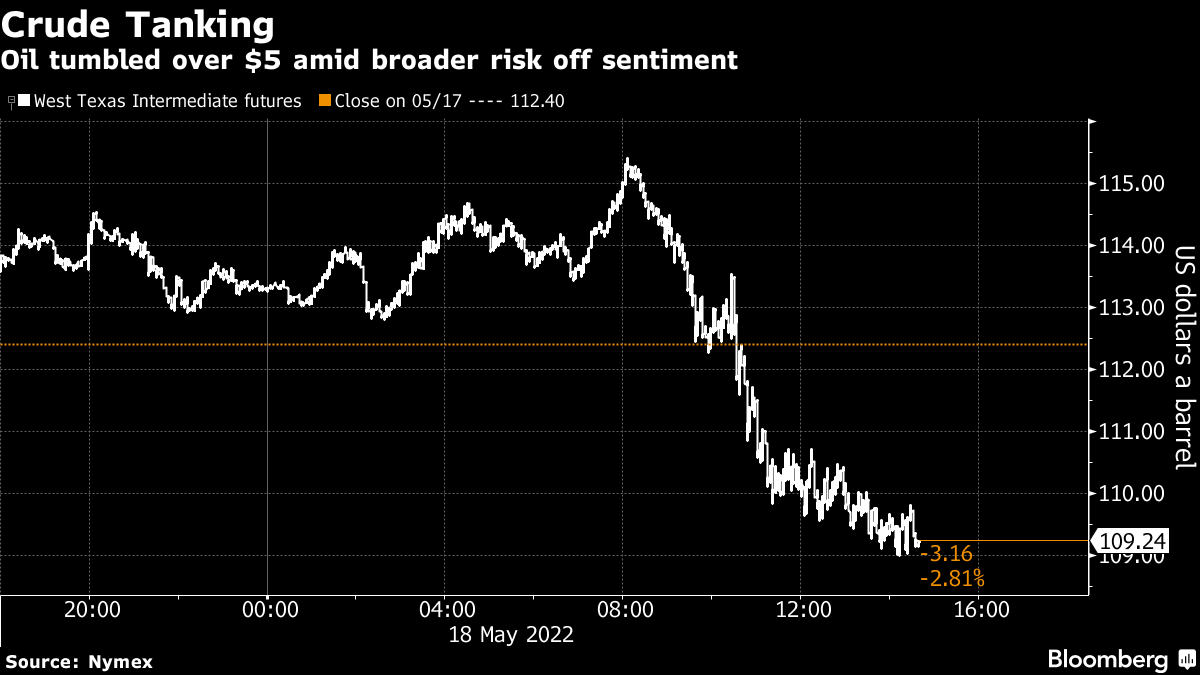 West Texas Intermediate settled below $110 a barrel after earlier rising to above $115. Beijing reported more new cases on Tuesday while Tianjin's Binhai area put another area under lockdown. The flareups underscore the challenges China faces in pursing Covid Zero policy, which have already taken an enormous economic toll. The decline also came amid a wider market selloff, with US stocks poised for the biggest daily drop in almost two years.