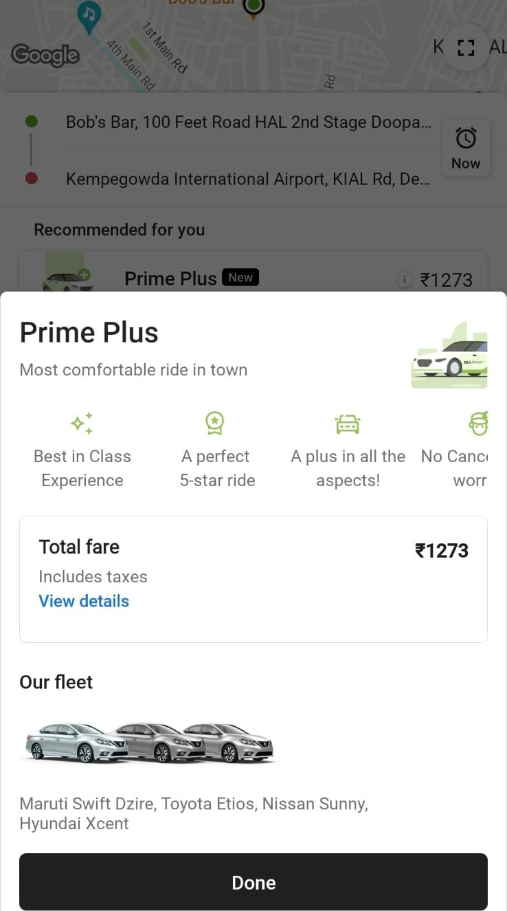 BQ Prime checked out the Prime Plus service on the Ola app. The fares were slightly higher than its Mini or Prime Sedan services, and the fleet used for Prime Plus rides only has sedans.