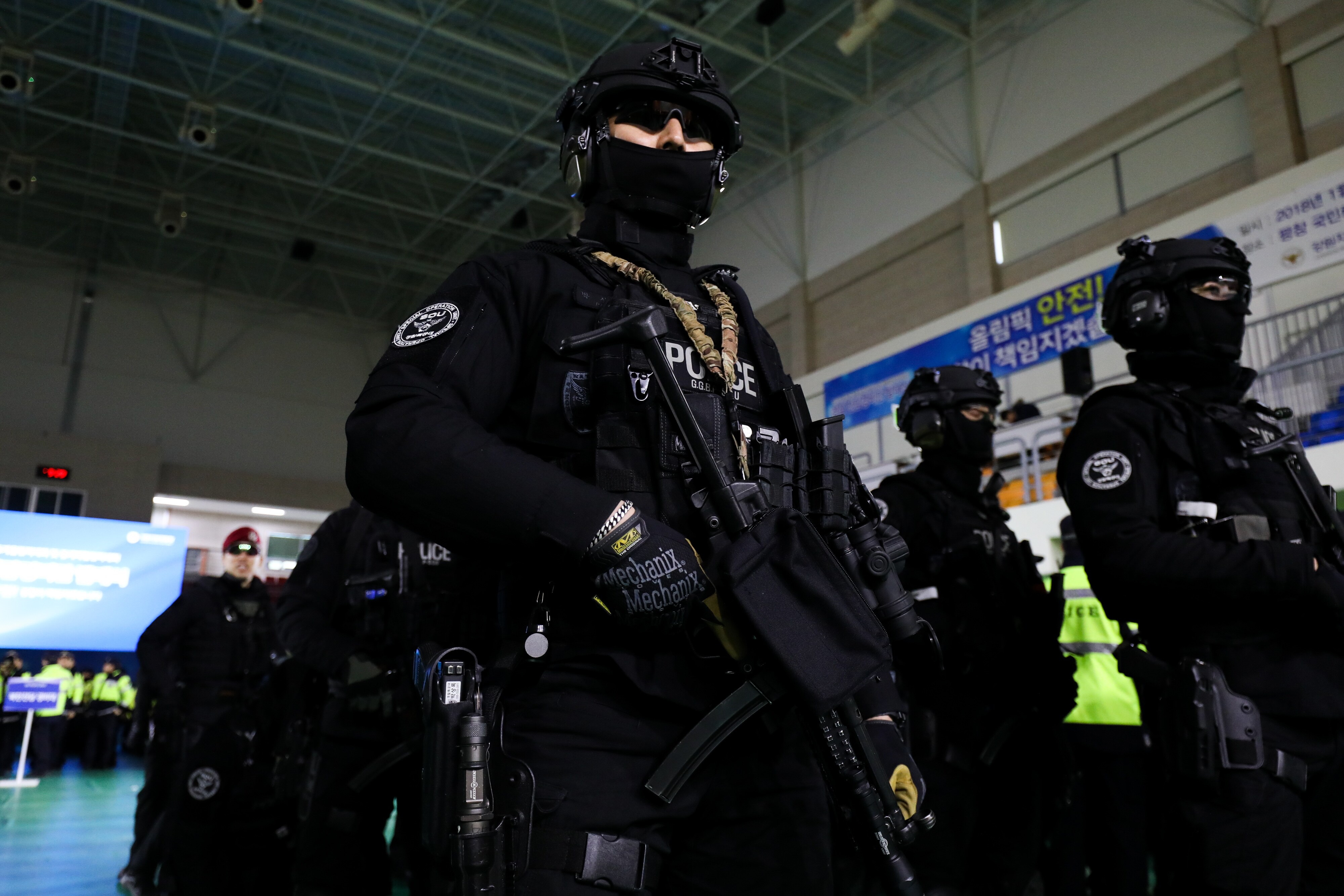 Members of the South Korean Special Weapons and Tactics team (SWAT) attend the inauguration ceremony for the designated special police battalion of the 2018 PyeongChang Winter Olympic Games in Pyeongchang, Gwangon, South Korea (Photographer: SeongJoon Cho/Bloomberg)