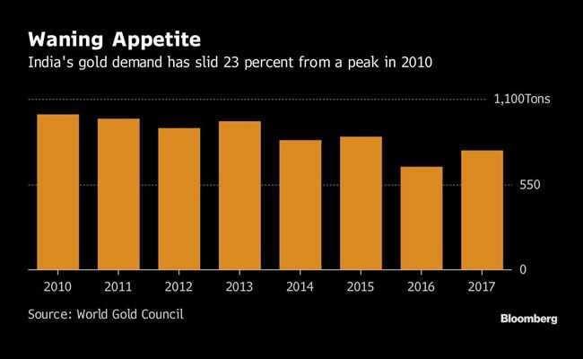 India's consumption of gold, almost all of which is imported, has been declining because of the government's efforts to curb its trade deficit and combat so-called black money by discouraging investors who used the metal to evade taxes. Demand for the yellow metal last year fell by about 23 percent from a peak of 1,002 tons in 2010. Meanwhile, benchmark gold futures in Mumbai are set to post a third year of annual gains in 2018 aided by a weaker rupee, which fell to a record low earlier this year.
