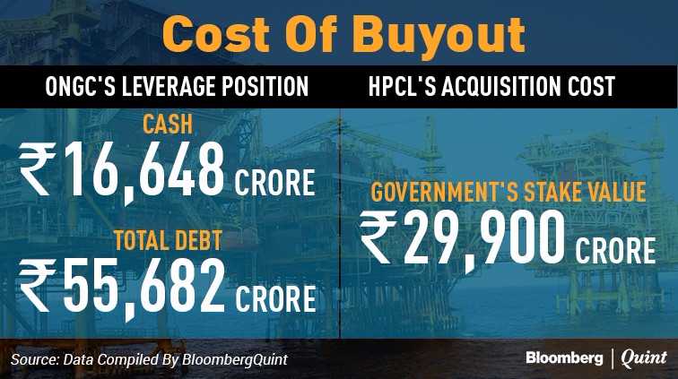 The government owns 68.07 percent in ONGC, and the acquisition will make HPCL its step-down subsidiary. The oil explorer, however, doesn't have the cash to fully fund the deal. It had Rs 16,648 crore cash as of March, leaving it short of more than Rs 12,000 crore at current valuations.
