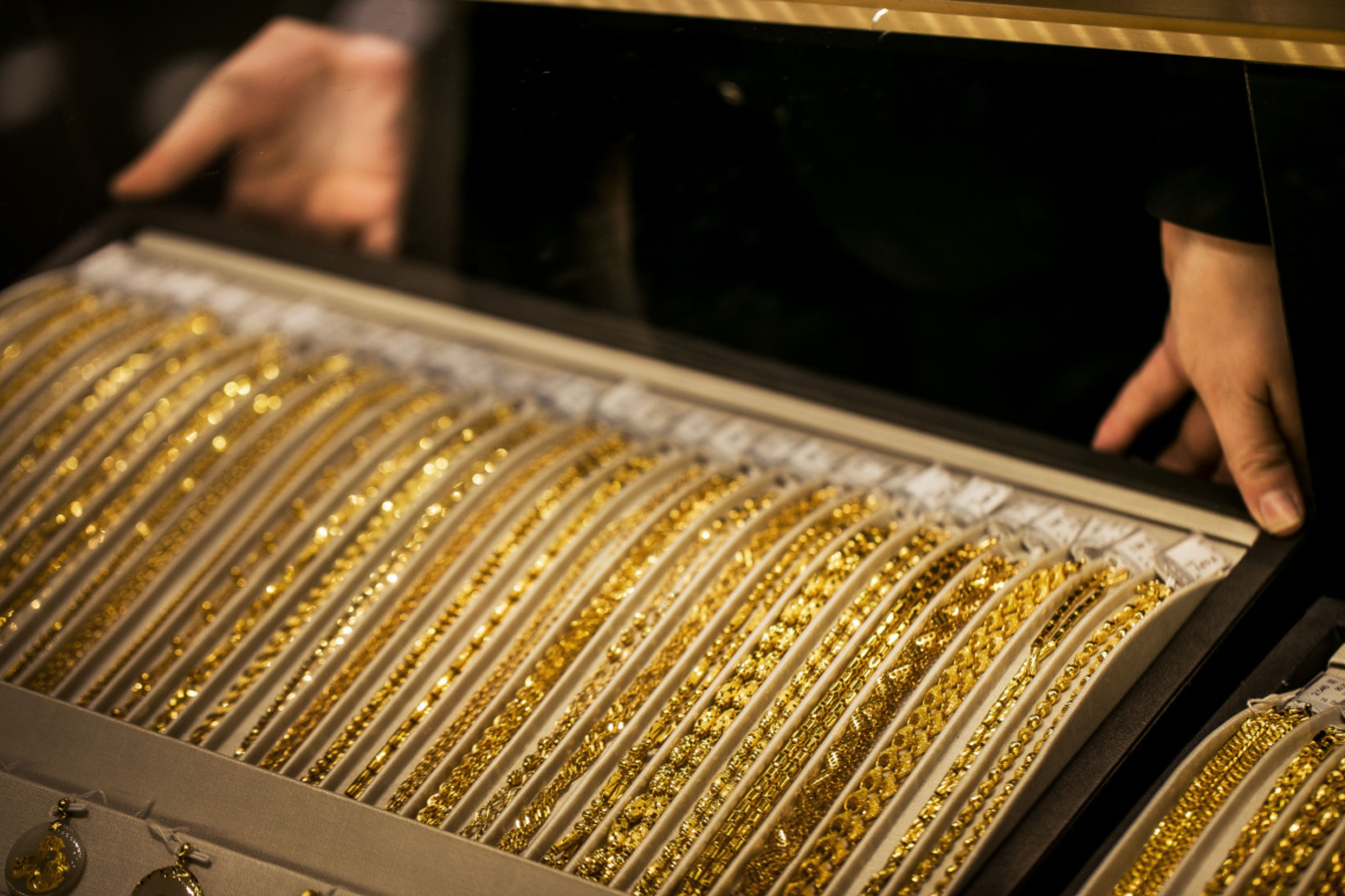 Gold necklaces sit on display inside a Chow Tai Fook Jewellery Group Ltd. jewelry store in the Central district of Hong Kong. (Photographer: Billy H.C. Kwok/Bloomberg)