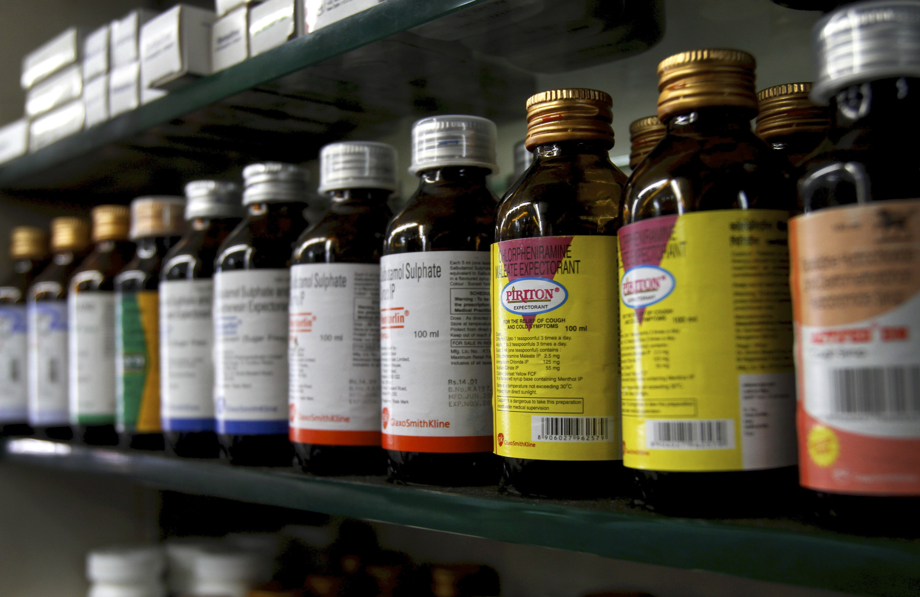Bottles of various medicines displayed at a pharmacy in Mumbai. (Photographer: Adeel Halim/Bloomberg)