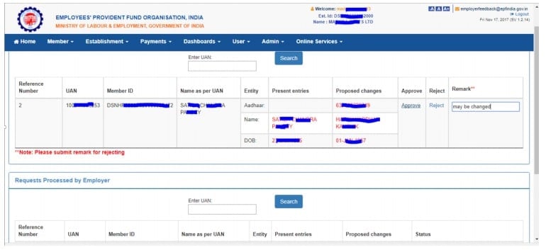At that time, an EPF subscriber looking to correct the basic details fed into his or her UAN had to submit a joint request, along with the employer, to the concerned EPFO Field Office. The online facility is aimed at reducing "the paperwork and time delay" in the existing process, according to the EPFO. Under the online process, the request is submitted online by the EPF member. The employer is then required to forward the online request to the concerned EPFO office.