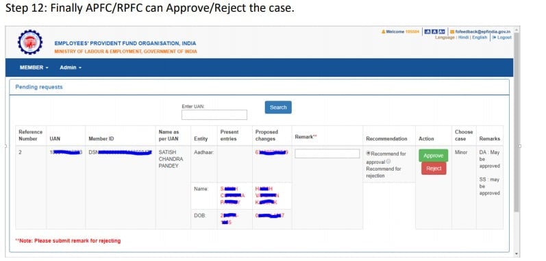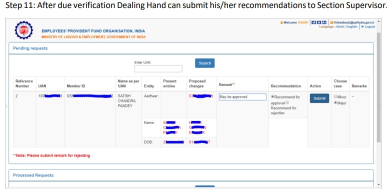 11: After due verification, the Dealing Hand can submit his or her recommendations to Section Supervisor. "The Dealing Assistant can put the case either for Approval or Rejection by selecting the appropriate radio button i.e. Recommended for Approval or Recommended for Rejection with proper remarks. In the same manner Section Supervisor can submit his/her recommendations to APFC/RPFC," according to the EPFO.
