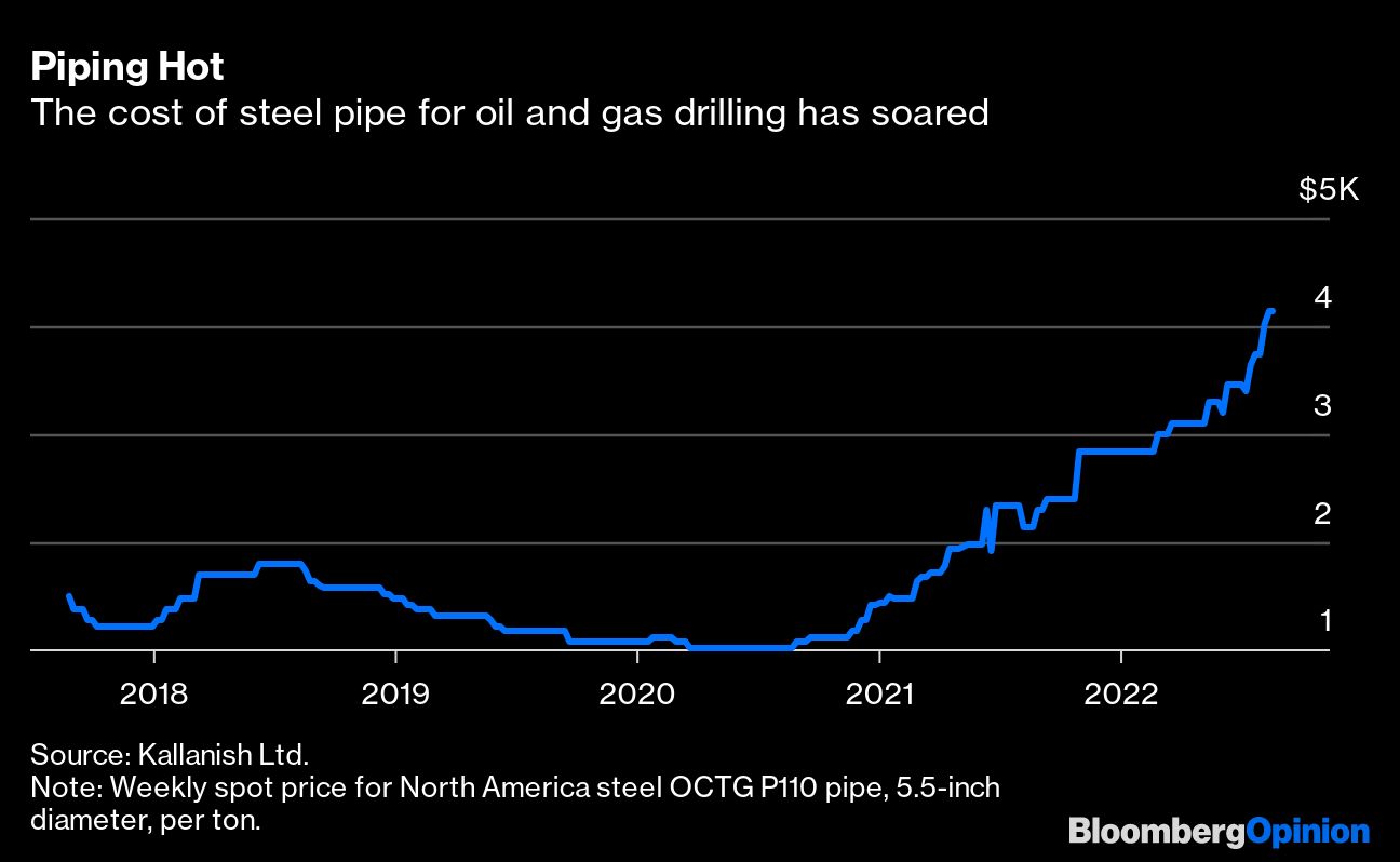 Even as US hot-rolled steel prices have dropped 60% from last year's peak, the price of oil country tubular goods, or OCTG — well-casing and pipes — has been on a tear as drilling and completions pick up from the lows of the pandemic. Oil prices have more than doubled over the past two years but the cost of benchmark P110, 5.5-inch steel pipe has almost quadrupled. Looking ahead, inventories remain tight, signaling higher costs for the industry.