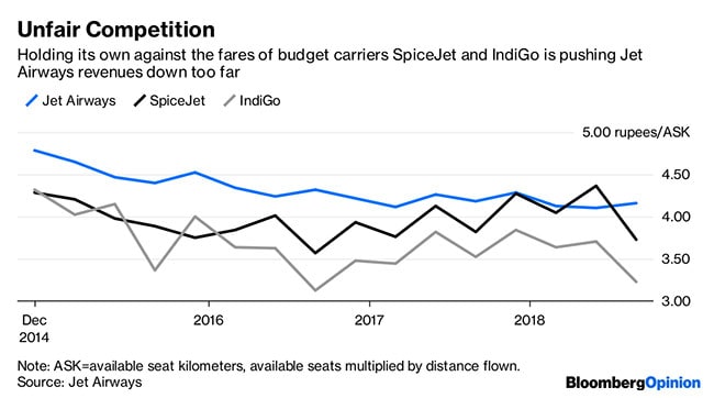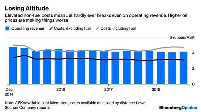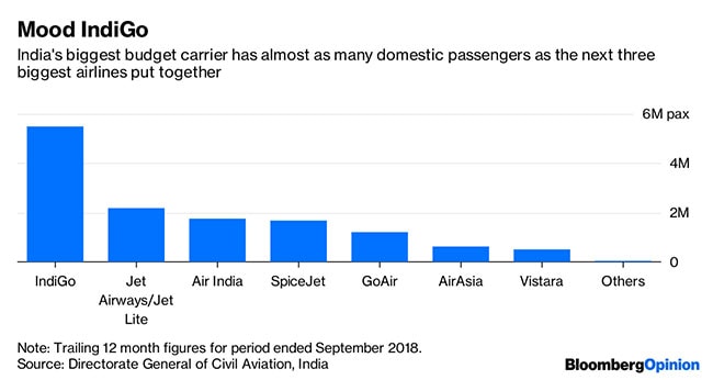 That caution over this bout of national service is hardly surprising. Jet has built up a substantial position in country's domestic aviation market: It's the biggest full-service carrier and the largest outright after the terrifyingly dominant budget carrier Interglobe Aviation Ltd., better known as IndiGo. Still, the smaller positions that Tata has staked out in joint ventures with Singapore Airlines Ltd. and AirAsia Bhd. are a much more sensible way of taking on the challenges of making money from getting India airborne.
