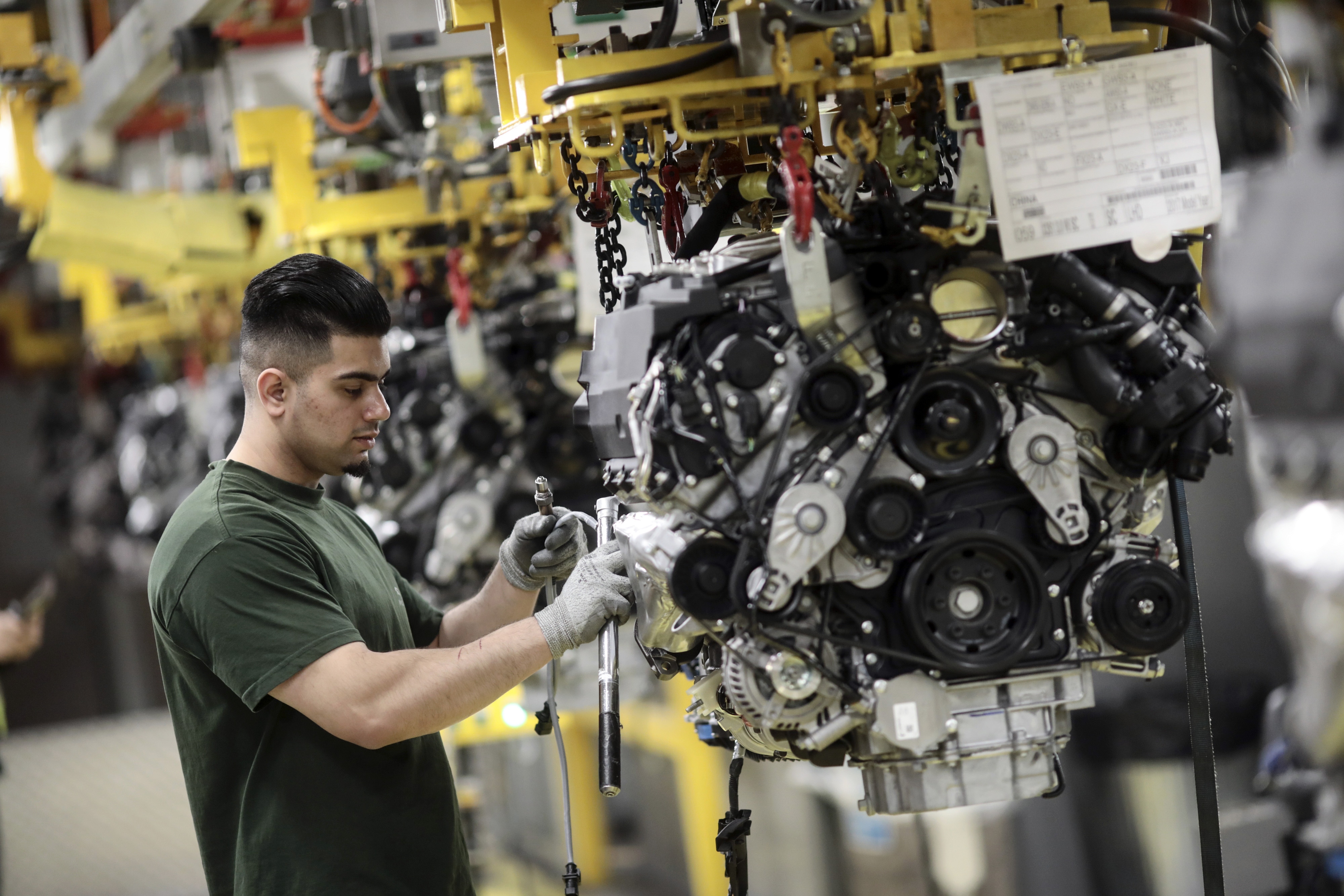 An employee works on the engine at a factory in U.K. (Photographer: Simon Dawson/Bloomberg)