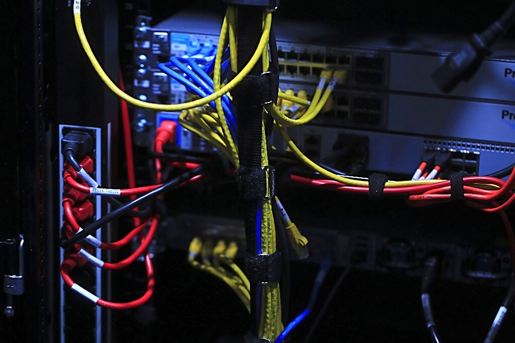 Colored wires connect a computer server at a tech fair in Hannover, Germany. (Photographer: Krisztian Bocsi/Bloomberg)