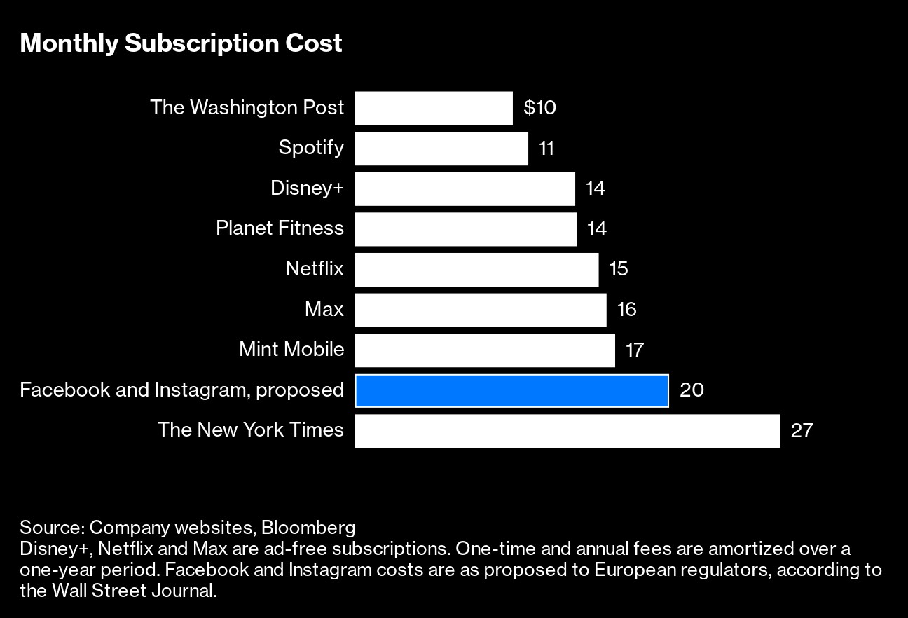 Competitors are working on similar offerings. Both TikTok and Snapchat are testing ad-free versions of their services. And Elon Musk, owner of X (aka Twitter), teased “a higher priced subscription that allows zero ads” in a post earlier this year. That would probably cost substantially more than X's current premium plan, which starts at $11 per month when purchased on a phone and cuts the number of ads in half. At a meeting with the company's bankers on Oct. 5, Chief Executive Officer Linda Yaccarino suggested X would create three different tiers of service, with prices going up as fewer ads are shown.